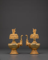 Enhance your spiritual space with this stunning Copper Ritual Bhumba Set, a sacred vessel used in Tibetan Buddhist rites for water offerings and blessings. This pair of bhumbas, measuring 23cm tall and 14.5cm broad, is typically put on altars to represent purity and invoke heavenly presence. These bhumbas are exquisitely crafted for ritual precision, reflecting the profound symbolism and rich cultural diversity of Himalayan spiritual rituals. The elaborate gold-plated detailing and historic design make this set an essential for both practitioners and collectors.