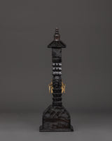The Dalucha holds deep cultural and spiritual significance in Newar Buddhist and Hindu traditions, where lighting an oil lamp symbolizes offering light to deities and dispelling ignorance. Traditionally hung in temples, shrines, and monasteries, it is a sacred vessel for illumination during rituals and prayers. The intricate craftsmanship, often featuring oxidized copper or brass with ornate embellishments, showcases Nepalese metalwork's devotion and artistic excellence. Beyond its religious use, the Dalucha enhances the ambiance of meditation spaces, bringing a sense of serenity, reverence, and spiritual connection.
