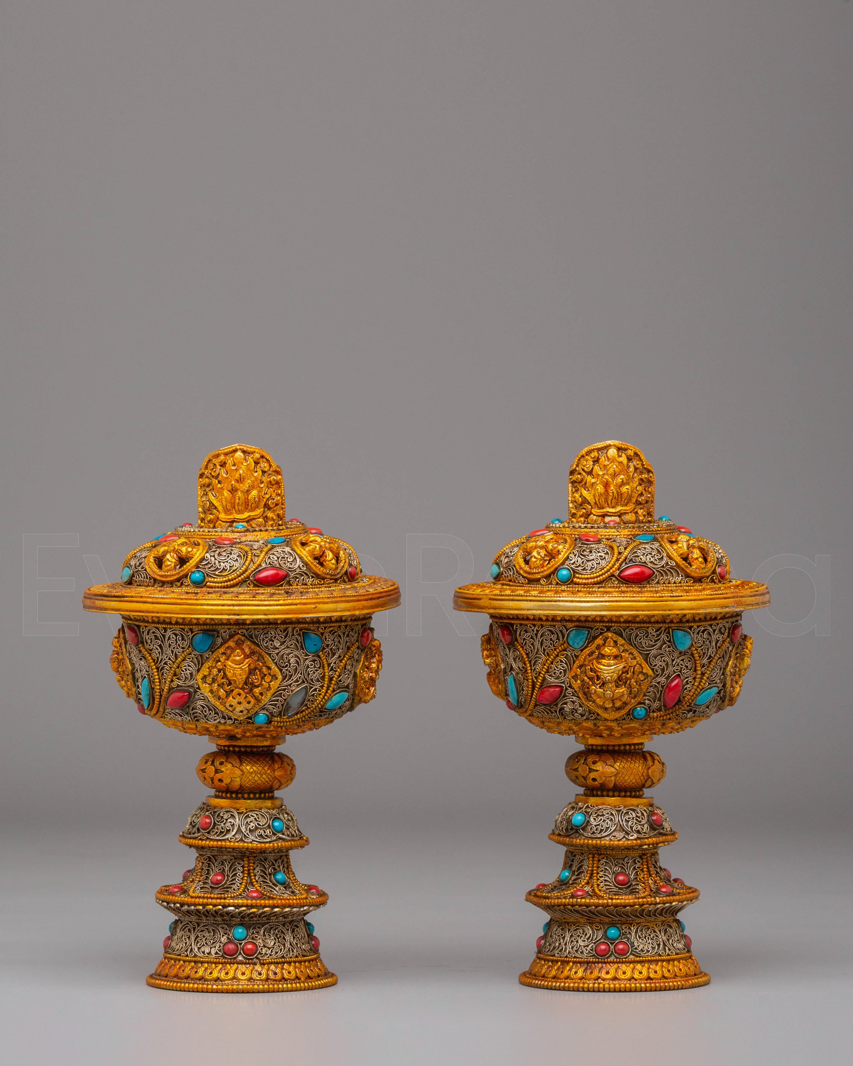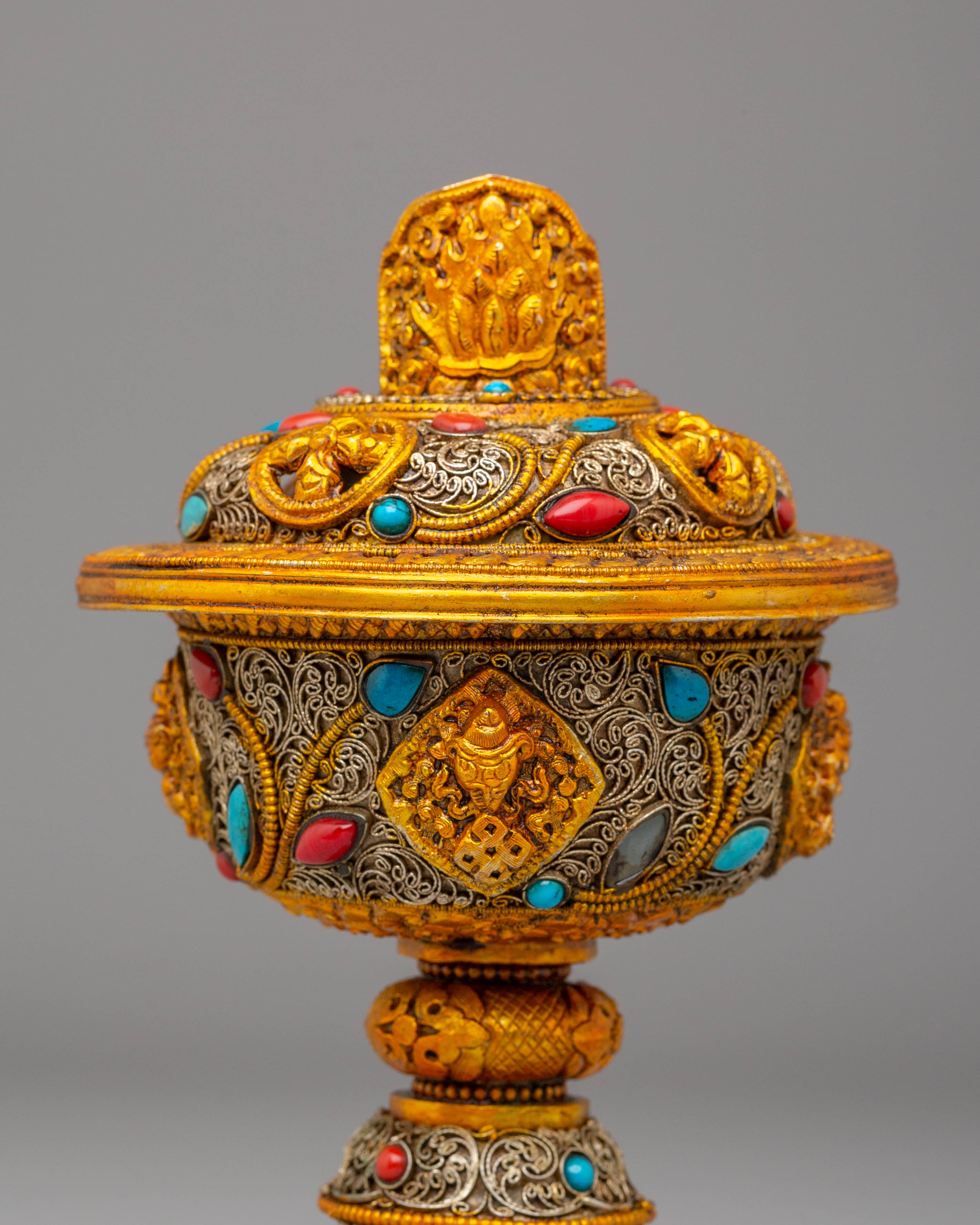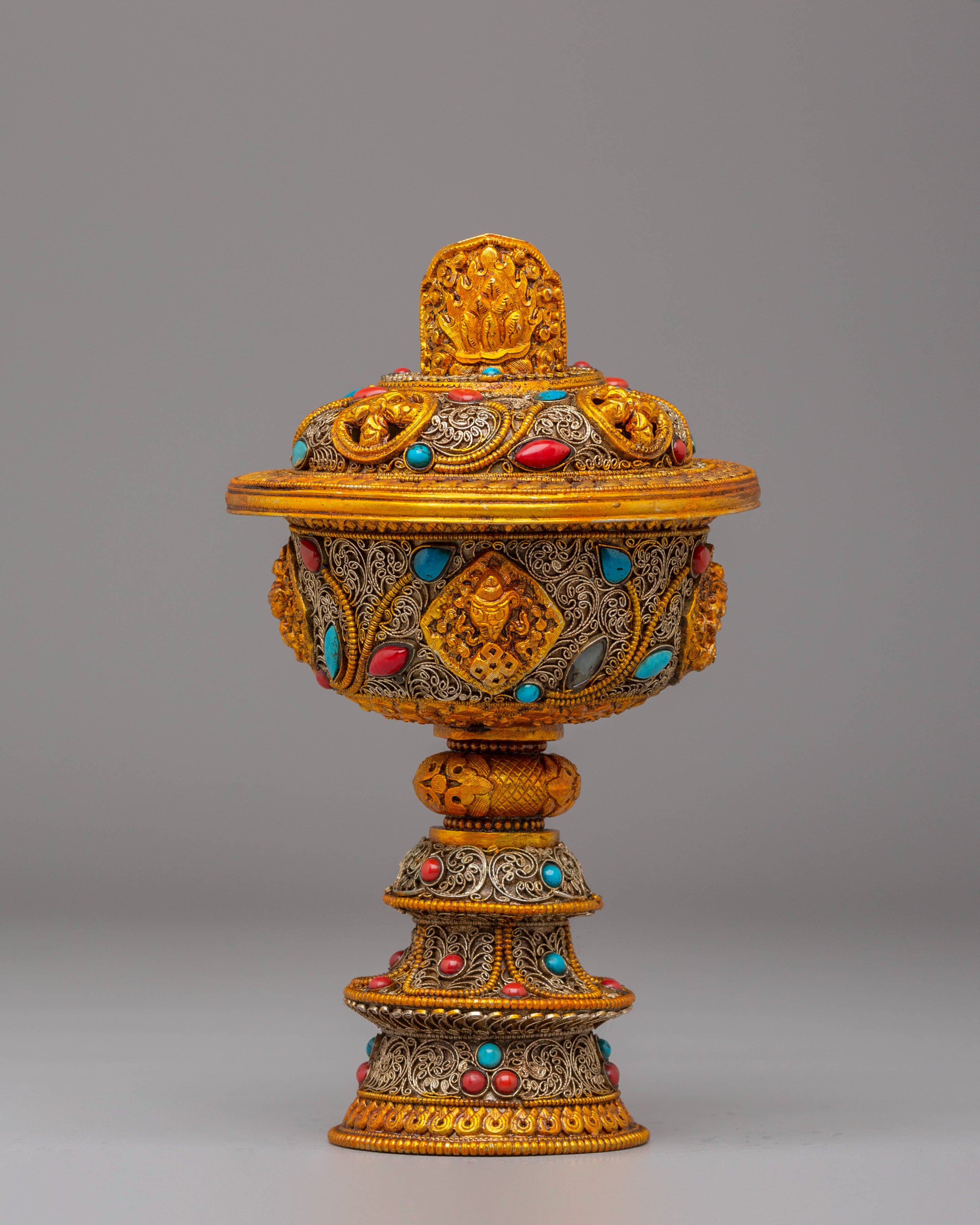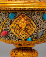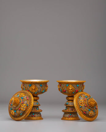 Each lamp is intricately designed with exquisite filigree that symbolizes Tibetan Buddhist creativity and the symbolism of purity and light. The gold plating gives the lamps a celestial radiance, while the gemstones, which are often turquoise and coral, reflect harmony and natural energies. This set encapsulates the essence of Tibetan Buddhist tradition and the practice of making gifts to Buddhas and Bodhisattvas, making it ideal for both ritual and ornamental purposes.