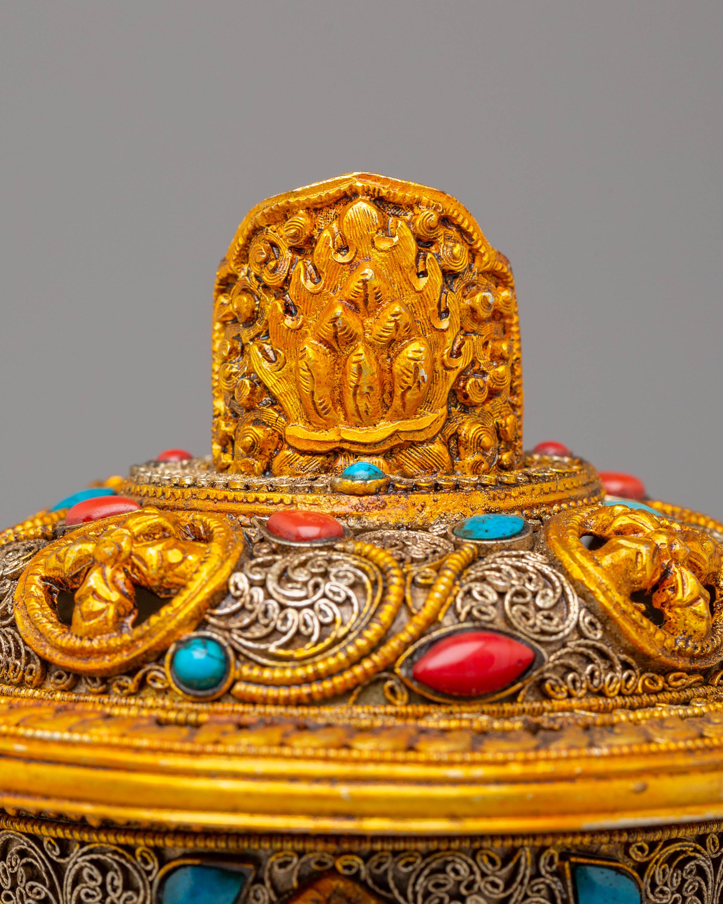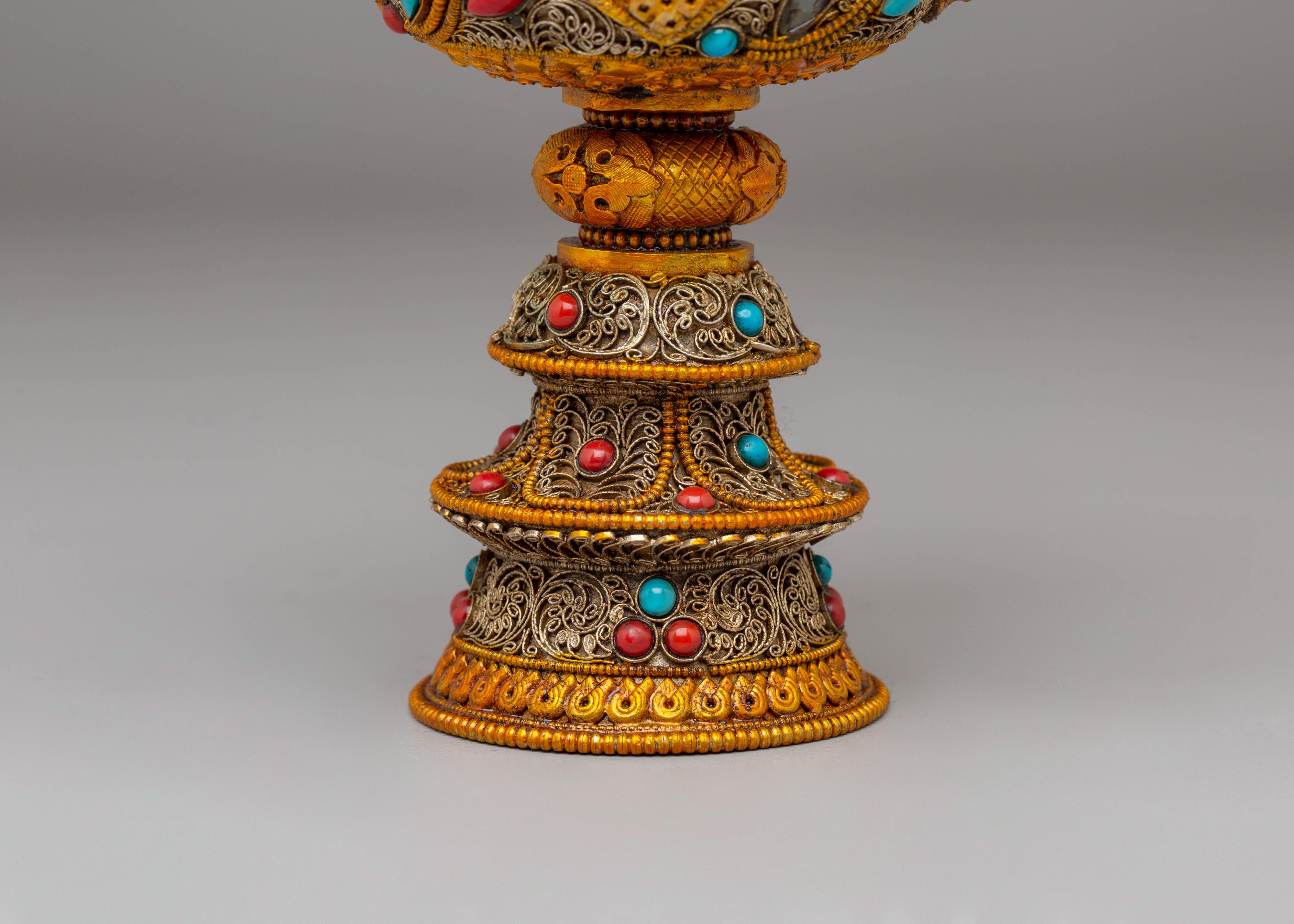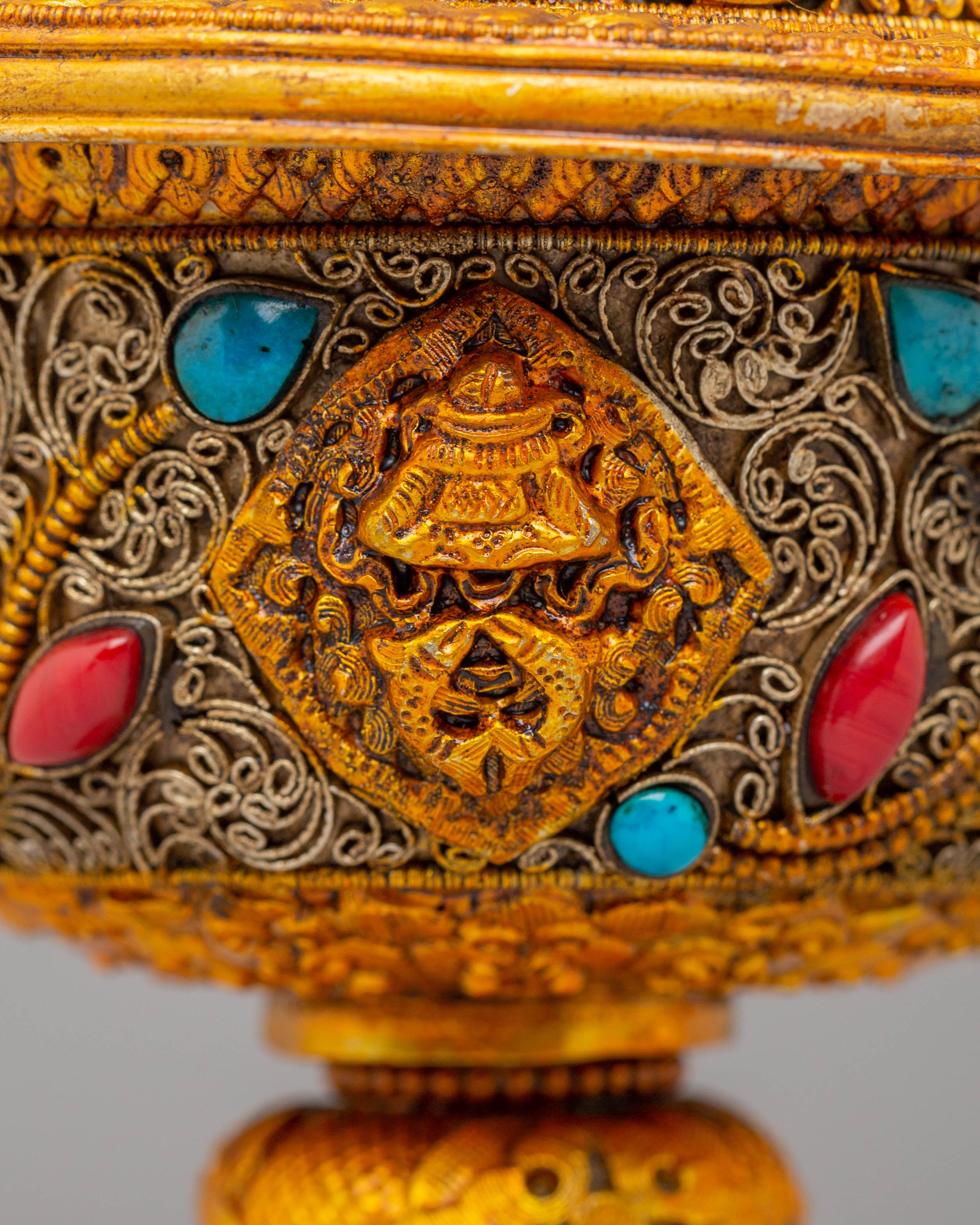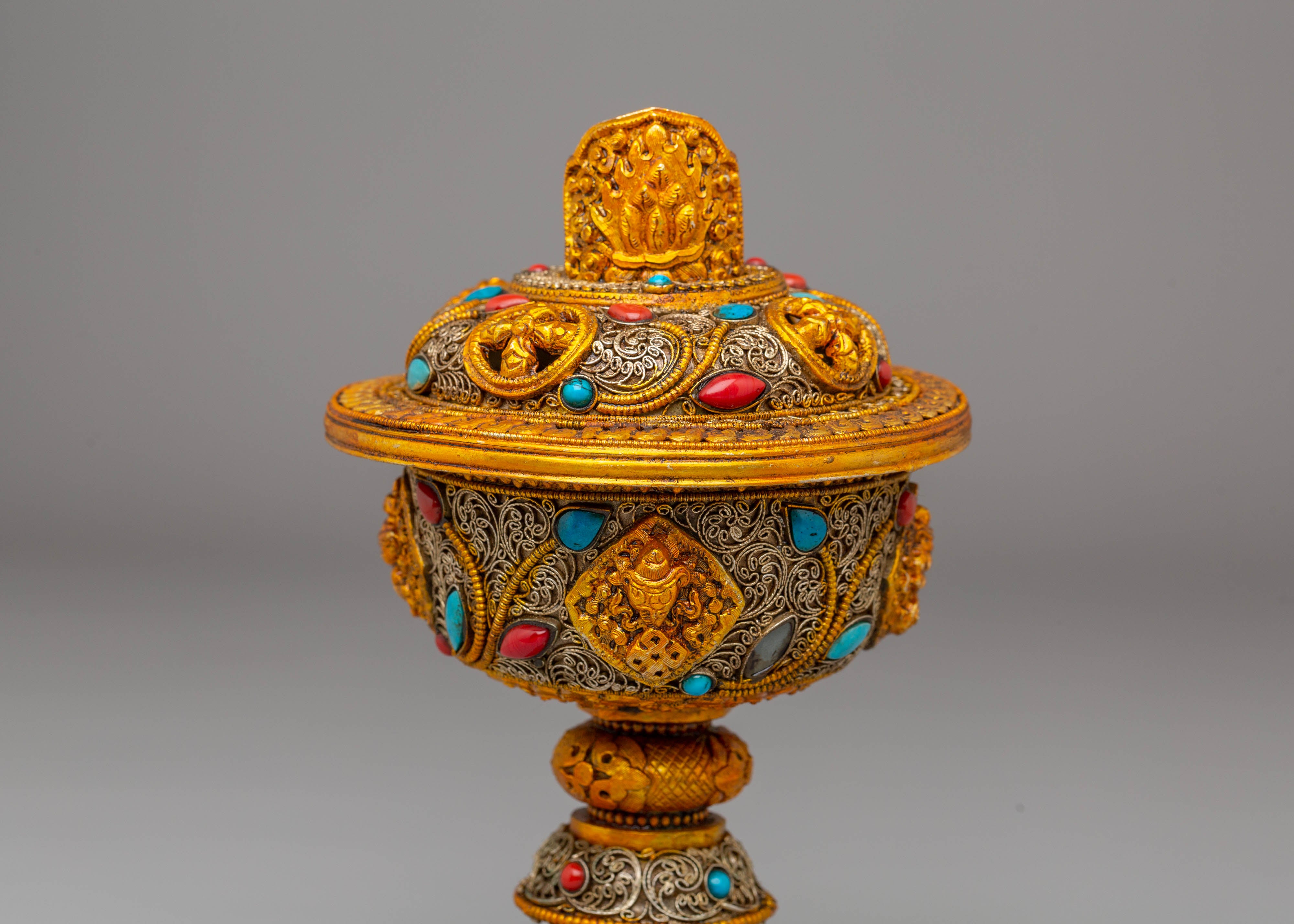 Each lamp is intricately designed with exquisite filigree that symbolizes Tibetan Buddhist creativity and the symbolism of purity and light. The gold plating gives the lamps a celestial radiance, while the gemstones, which are often turquoise and coral, reflect harmony and natural energies. This set encapsulates the essence of Tibetan Buddhist tradition and the practice of making gifts to Buddhas and Bodhisattvas, making it ideal for both ritual and ornamental purposes.