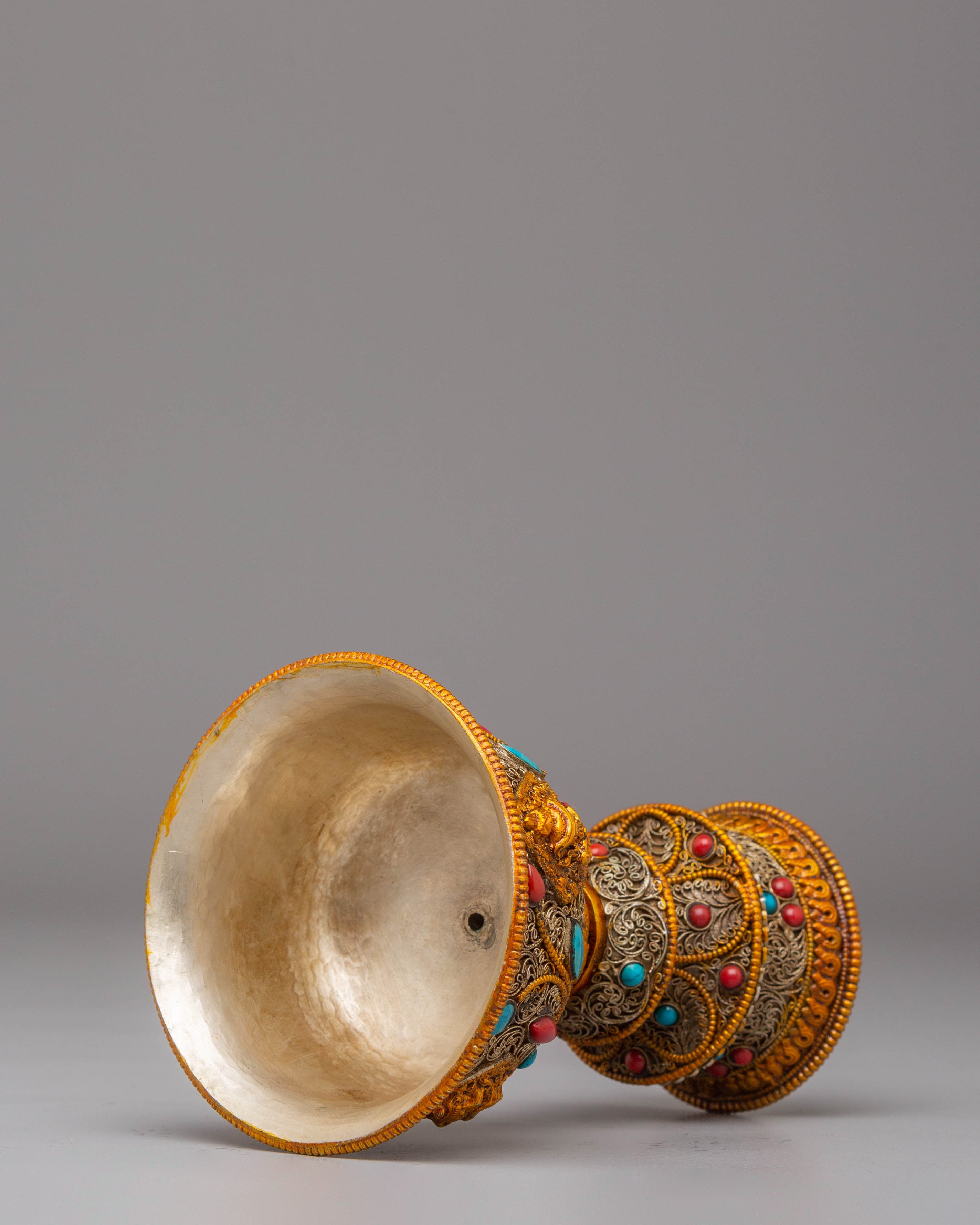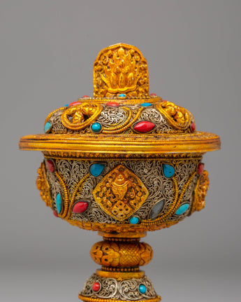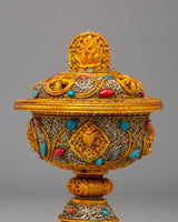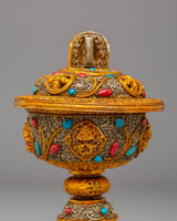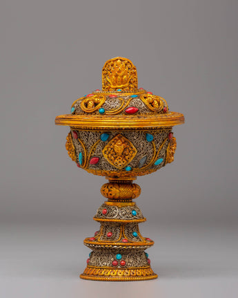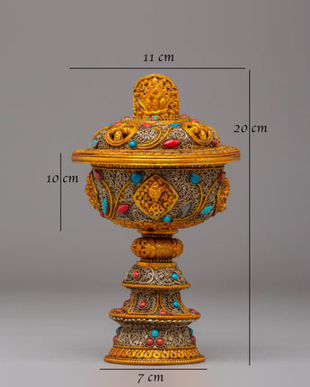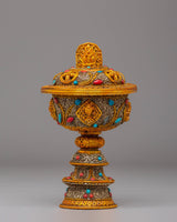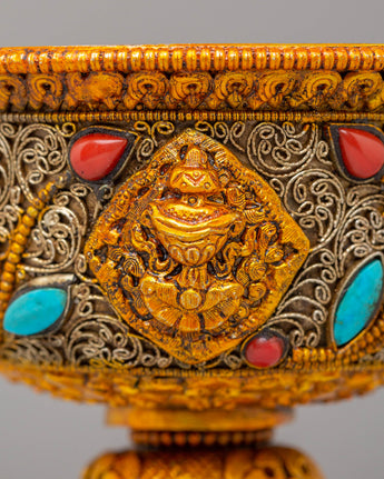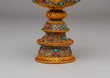 Enhance your spiritual practices with this Electro-Gold-Plated Butter Lamp Set, an excellent addition to any Buddhist altar or meditation space. The copper body is meticulously crafted and plated with both electro gold and electro silver, resulting in a striking, luminous finish. The gemstone accents add to the lamp's beauty and spiritual meaning. This set is intended for use in Buddhist ceremonies, namely those involving butter lamp offerings, which represent the elimination of darkness and the illumination of wisdom.