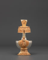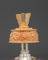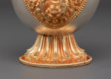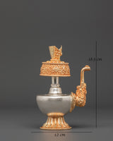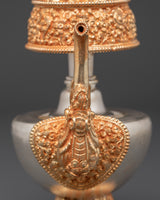 Enhance your spiritual atmosphere with this Gold and Silver Plated Bhumba, a delicate ritual vessel carved from copper. This ceremonial ritual Kalash, which measures 18.5cm in height by 12cm in breadth and weighs 0.46kg, is excellent for Buddhist and Hindu religious events. The meticulous craftsmanship is enhanced with bright gold and silver plating, which represents purity, prosperity, and spiritual enlightenment. This precious Bhumba pot holds holy water during rituals and is a must-have for every altar or temple.