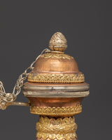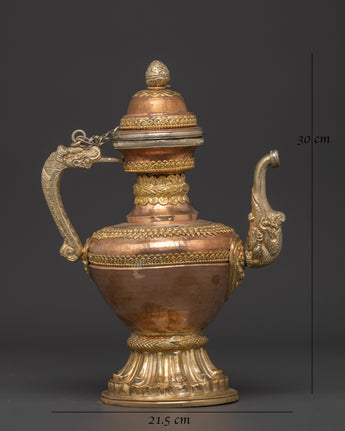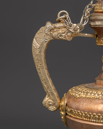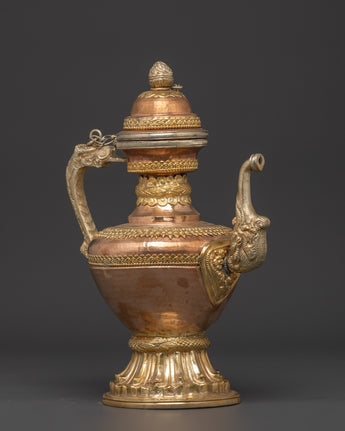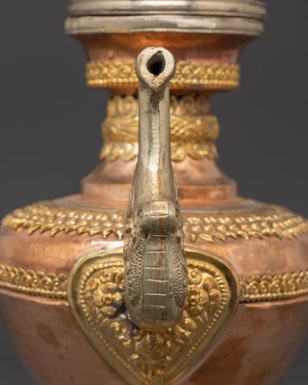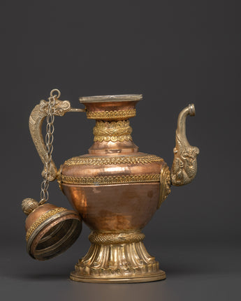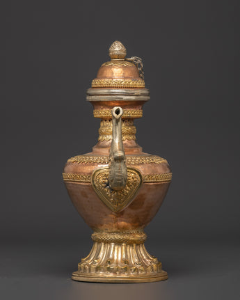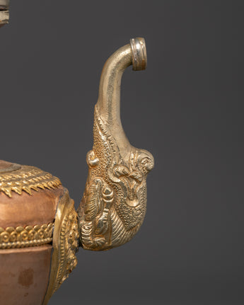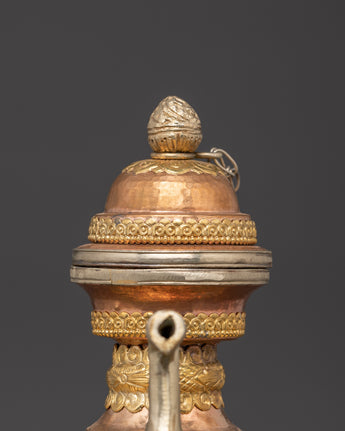Water is essential in both Hindu and Buddhist rites, and it is always present on the altar, either in a pricey pot or in another container. Bhumba is a pot shaped like a flat jar, featuring a pipe to draw out the water from the pot, which is elaborately embellished with valuable stones and metal.