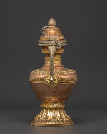 Enhance your spiritual practice with this handcrafted Copper Bhumba Set, made of copper and brass components. Each piece measures 30cm in height and 21.5cm in width, weighing approximately 0.93kg, for a total set weight of 1.86kg. This provides an attractive and reliable feel, ideal for tantric rituals and meditation ceremonies.
