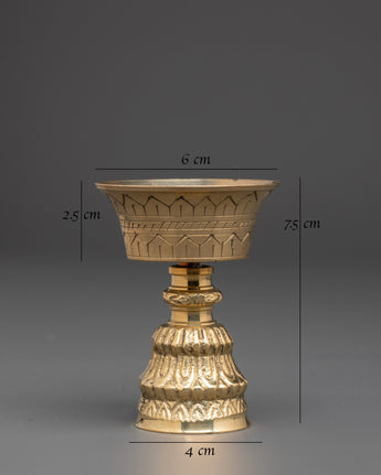 Crafted with precision from brass, this butter lamp features a detailed etching and an ornate base with traditional motifs. Its smooth interior, with a depth of 2.5 cm, is designed to hold butter, oil, or ghee, producing a steady flame that enriches your meditation area. Lighting this lamp honors Buddhas and Bodhisattvas while welcoming clarity and wisdom into your life. Weighing 0.11 kg, this sacred piece adds meaningful symbolism to your spiritual space.