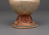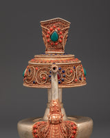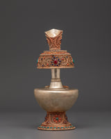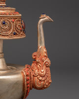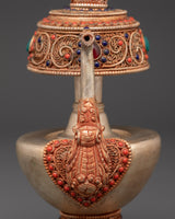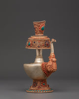 This Bhumba is expertly handcrafted from copper and plated with silver to radiate ceremonial elegance. It is adorned with intricate filigree work and inlaid with vibrant artificial turquoise and coral stones, reflecting the refined artistry of Himalayan metalwork. The bold spout is sculpted in the shape of a guardian figure, believed to protect sacred offerings and energy. Whether used in rituals or displayed on a shrine, the Bhumba is a powerful symbol of purity and intention.