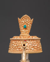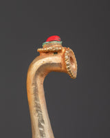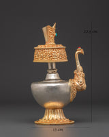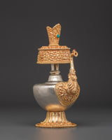 The vase is exquisitely detailed, featuring an intricate spout, a raised Vajra crown, and a typical peacock design. This Bhumba, adorned with artificial coral and turquoise stones, is a potent ceremonial tool as well as a symbol of wealth, wisdom, and spiritual purity. It is frequently utilized on altars during empowerment ceremonies and water offerings, but it also has symbolic meaning in mandala offerings and temple settings.