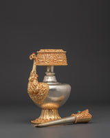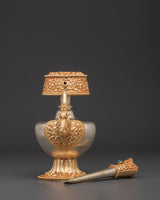 Water is essential in both Hindu and Buddhist rites, and it is always present on the altar, either in a pricey pot or in another container. Bhumba is a pot with the shape of a flat jar, featuring a pipe to draw out the water from the pot, which is elaborately embellished with valuable stones and metal.