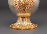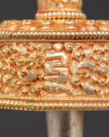 This Handmade Traditional Bhumba Vase is a revered Tibetan ceremonial object used to perform Vajrayana Buddhist practices, including blessings, offerings, and purifying rites. This sculpture, which measures 22.5 centimeters in height and 13 centimeters in width and weighs 0.74 kilograms, is skillfully created from copper and beautifully plated in gold and silver.