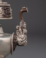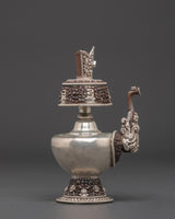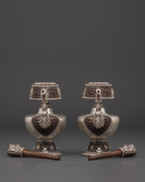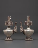 Each vase weighs 0.54kg, for a total set weight of 1.08kg, making this combination both strong and simple to handle for altar arrangements or ceremonial applications. The peacock spout, which represents compassion and wisdom, adds to the set's spiritual energy, while the intricate metalwork symbolizes the rich elegance of Himalayan handicraft. These vases are ideal for ceremonial receptacles for water offerings or consecration rites during puja in monastery settings or on home altars.