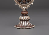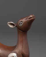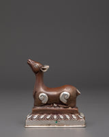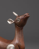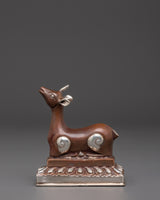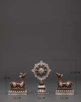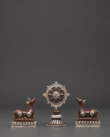 The wheel measures 12.5cm in height and 7.5cm in width with a weight of 0.20kg, while each deer measures 8cm in height and 7.5cm in width with a combined weight of 0.58kg. Altogether, the full set weighs 0.79kg. Handcrafted from oxidized copper and finished with elegant silver plating, this altar set beautifully combines traditional Himalayan artistry with profound spiritual meaning. It is ideal for use in rituals, meditation spaces, shrines, and as a centerpiece for Buddhist practice.