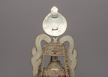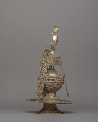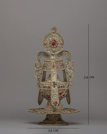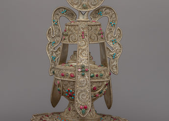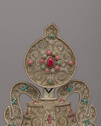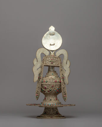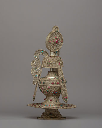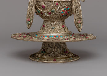 This stunning Tsebum Long Life Vases is handmade from sturdy copper and electroplated with a smooth silver finish, highlighting excellent creativity and ancient Tibetan symbolism. These ceremonial vases, 35 cm tall and 19 cm wide, are intricately embellished with filigree designs and symbolic symbols representing longevity and spiritual wealth. The vases' bases and bodies are decorated with intricate carvings, featuring delicate flower and filigree motifs that highlight their cultural and aesthetic worth.