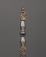 The Rinzin Daru Ritual Set includes two handcrafted ceremonial implements, an Emblem Daru and a Flat Daru. The Emblem Daru stands 29 cm tall and 6 cm wide, with a brilliantly painted Golden Fish auspicious emblem at the top. Its companion, the Flat Daru, is 27 cm tall with a blade-shaped structure and a width of 1.7 cm. The set weighs 0.580 kg and is built of an iron body inlaid with silver and brass. Both items are intricately crafted and showcase traditional Himalayan metalwork craftsmanship.