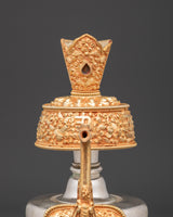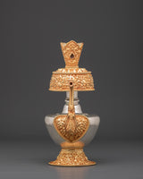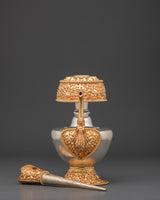 The Ritual Bhumba is a finely crafted sacred vessel designed for meaningful Tibetan Buddhist ceremonies. Made from copper and elegantly plated with silver and gold, it stands 28 cm tall and 16.5 cm wide, weighing 0.92 kg to provide a substantial presence during rituals. This vessel is traditionally used to offer food, water, or symbolic items to deities, embodying devotion and fostering a deep spiritual connection. Its exquisite craftsmanship and sacred purpose make it an essential tool for anyone seeking to enhance their ritual practice with authenticity and reverence.