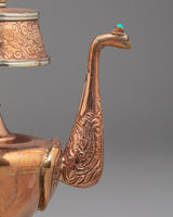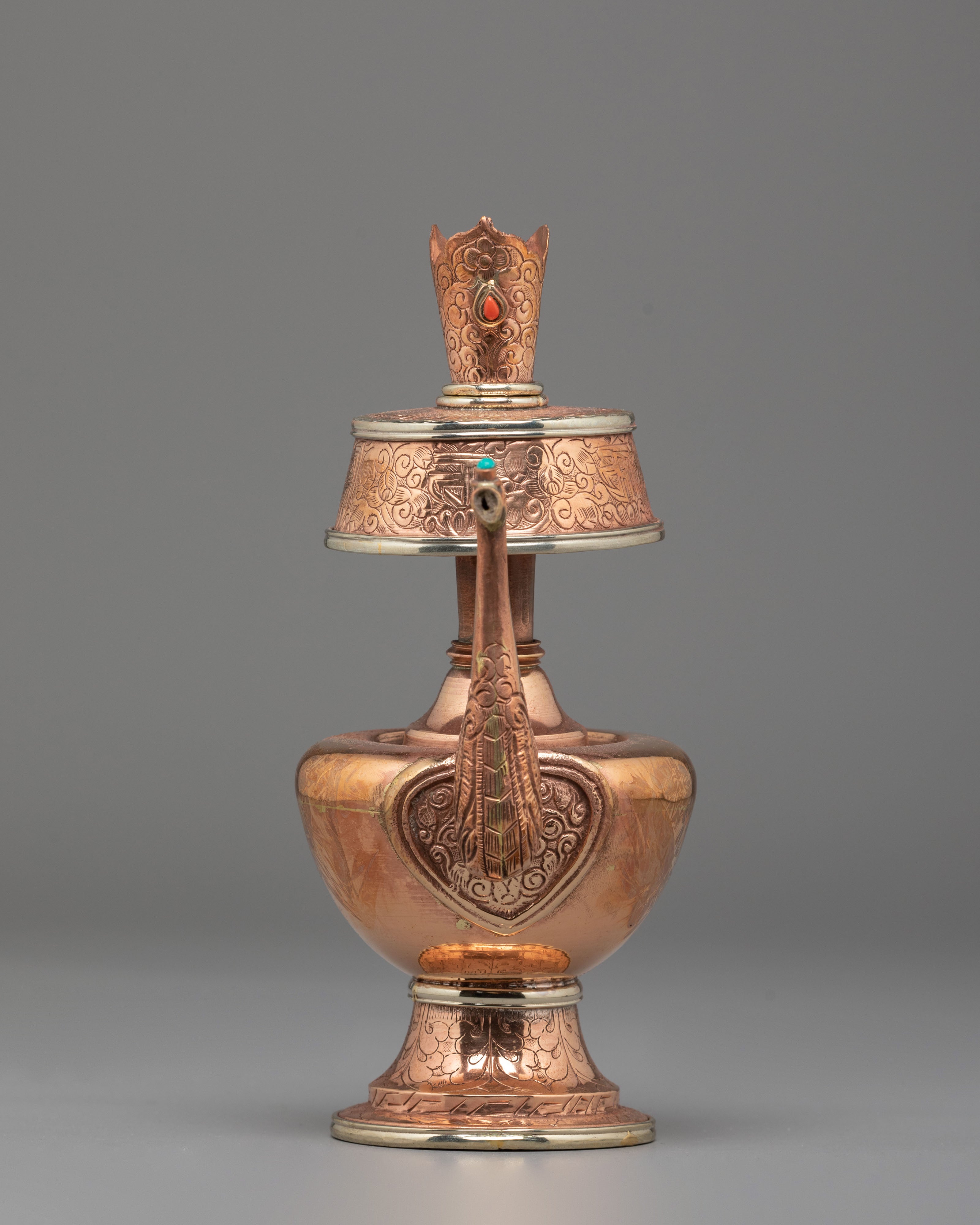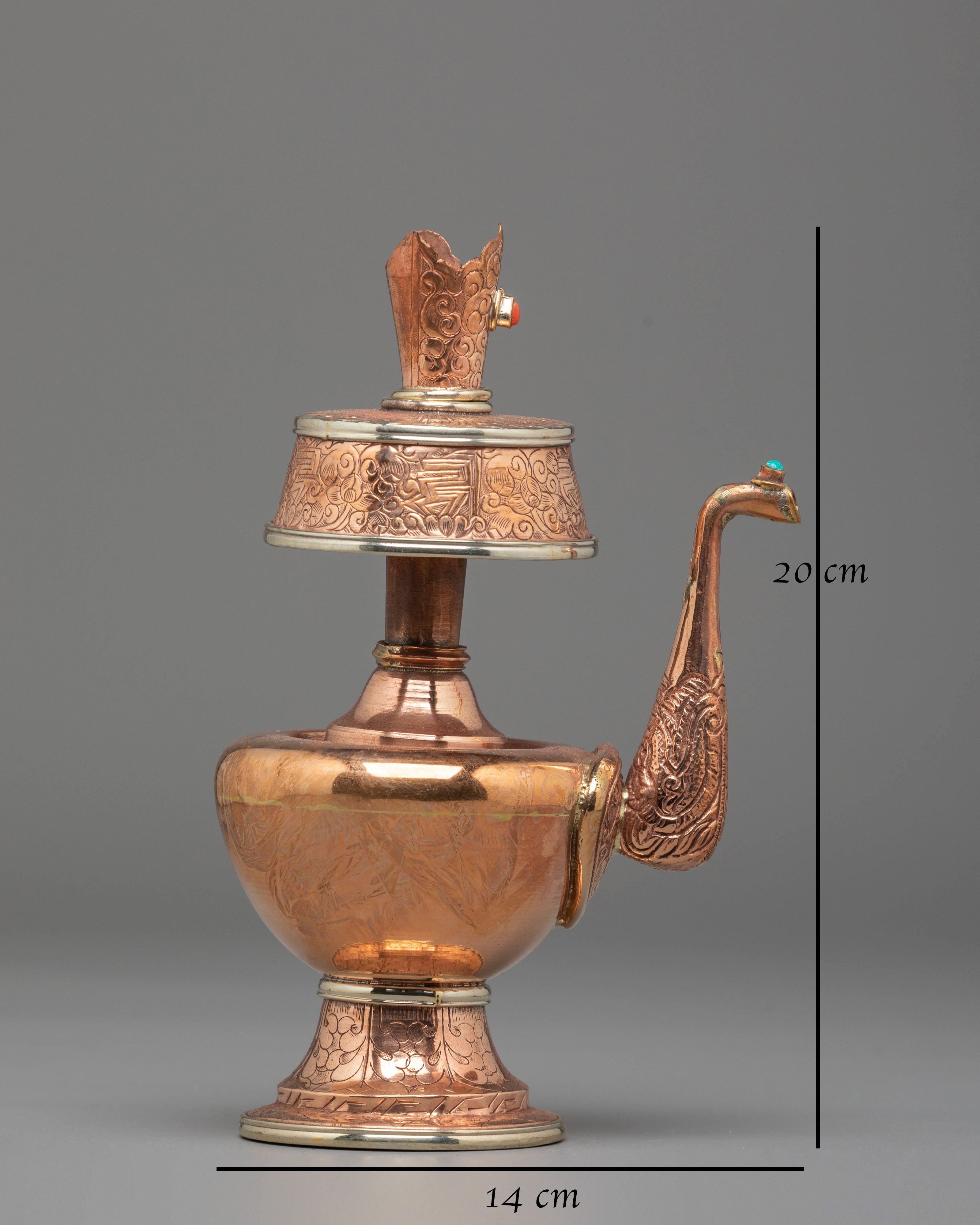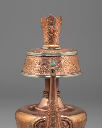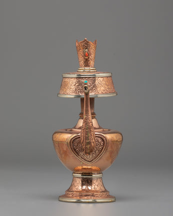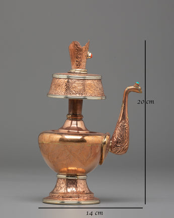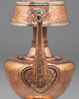 The intricate design features a beautifully detailed lid with symbolic motifs that represent divine protection and blessings. The elegant spout adds to the vessel's refined look, making it both practical for use and aesthetically pleasing. The white metal accents complement the copper body, enhancing its visual appeal while adding to the vessel’s spiritual significance. The motifs on the vessel's body evoke themes of purity, divinity, and protection, reinforcing its purpose in sacred ceremonies.