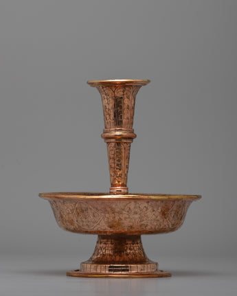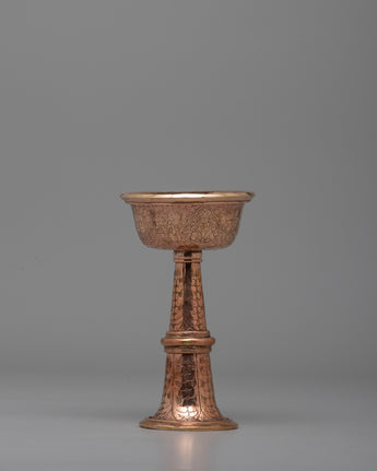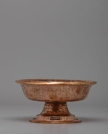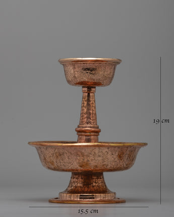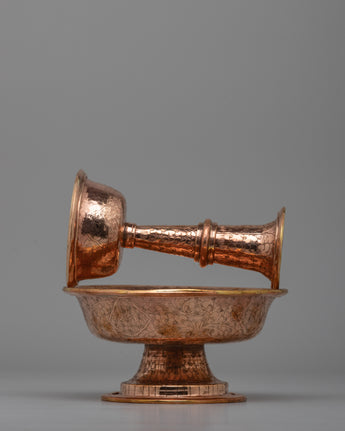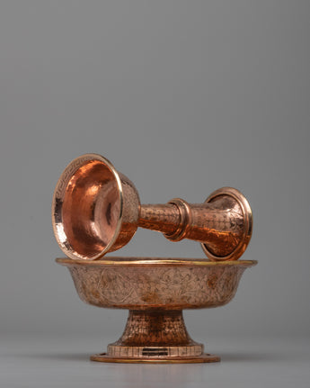 Traditionally used in Tibetan Buddhism for water or beverage offerings, this set represents dedication and charity. The two-tiered form enables the delicate pouring and gathering of gifts, which represent thanks and reverence for deities and enlightened beings. The warm copper tone and exquisite design transform it from a ceremonial object into a gorgeous ornamental piece that evokes awareness and spirituality.
