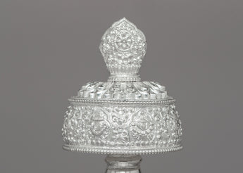 Our Silver Bhumba Ritual Vase, 20.5cm tall and 9cm wide, is precisely created from 27 Tola of pure silver (0.318kg). The Bhumba, an important symbol in Tibetan Buddhist rites, represents purity, plenty, and the flow of spiritual energy. It is used to store sacred offerings during cleansing ceremonies and blessings, making it an indispensable addition to any Buddhist altar or meditation room. The beautiful engravings and polished silver surface not only add elegance but also convey profound spiritual meaning.