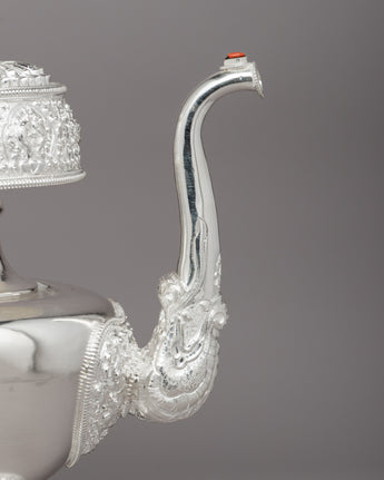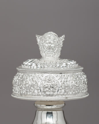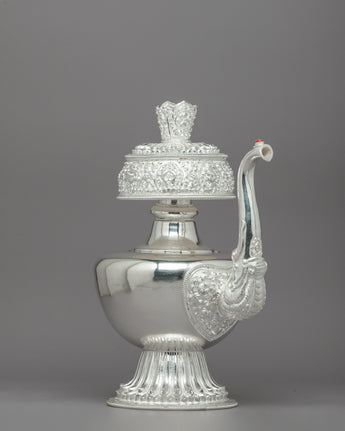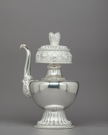 This ceremonial water vase features beautiful engravings and carved elements that reflect traditional Tibetan craftsmanship. The finely polished silver surface and delicate carvings heighten its spiritual significance, while the beautiful lid and bent spout increase its visual and symbolic value. The spout, which is commonly formed like a dragon or legendary entity, depicts the flow of wisdom and sacred energy, emphasizing its importance in purifying and protection rituals.