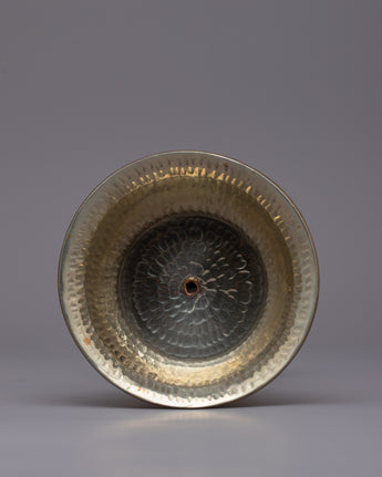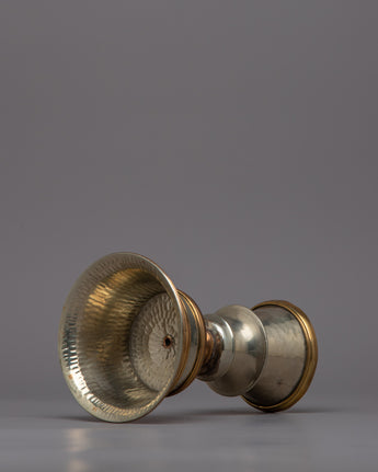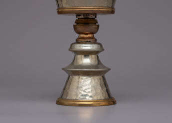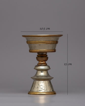Presenting the Butter Lamp Set, an exquisitely constructed set that embodies the spirit of traditionally practiced in Tibetan Buddhist ceremonies. This gorgeous butter lamp is composed of a copper body and has a sophisticated silver finish. It weighs 0.64 kg and measures 15 cm in height and 10.5 cm in diameter. As a symbol of enlightenment and the dispelling of darkness and ignorance, the elaborate design and precise craftsmanship reflect the rich spiritual tradition and artistic excellence of Tibetan artists.