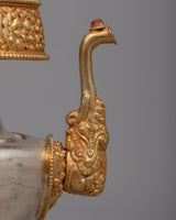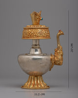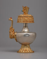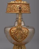 Water is essential in both Hindu and Buddhist rites, and it is always present on the altar, either in a pricey pot or in another container. Bhumba is a pot with the shape of a flat jar and a pipe to draw out the water from the pot that is elaborately embellished with valuable stones and metal.