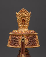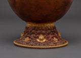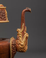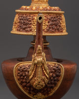 This gold-plated Bhumba jar, handcrafted with extreme perfection, is an invaluable instrument for Buddhist rituals and ceremonies. It serves as a conduit for offerings, fostering a holy bond between the practitioner and the divine. The oxidized copper lends the piece a historical and mystical aspect, while the gold plating adds a layer of magnificent richness. This Bhumba vessel, a significant artifact in Tibetan spiritual practice, is perfect for adding to your Himalayan altar decor or as a thoughtful gift for someone dedicated to Buddhist spirituality. Its symbolic significance and craftsmanship make it an excellent choice for any spiritual practitioner looking to strengthen their connection with Tibetan culture and rituals.