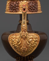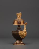 Water is essential in both Hindu and Buddhist rites, and it is always present on the altar, either in a pricey pot or in another container. Bhumba is a pot with the shape of a flat jar and a pipe to draw out the water from the pot that is elaborately embellished with valuable stones and metal.