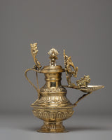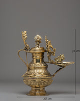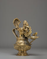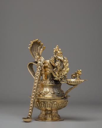 The design showcases intricate floral motifs and flowing patterns carved around the vessel, creating depth and refined artistry. The sculpted handle adorned with serpent forms symbolizes divine guardianship, while the extended spout represents the flow of sacred offerings. A brass ladle hangs on the side, adding ceremonial function and completing the traditional composition. The lower bowl features petal-style engravings, mirroring the lotus—an emblem of purity and spiritual awakening. With its rich carvings and Ganesh iconography, the Sukunda stands as a symbol of blessing, wisdom, and cultural devotion.