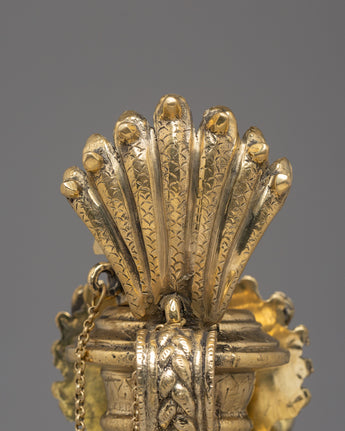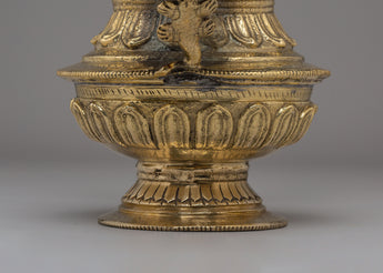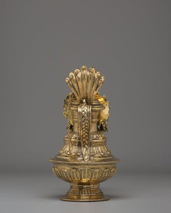 Crafted from brass, this Traditional Nepali Sukunda is a culturally treasured ritual lamp rooted in Newar heritage, used in ceremonies to honor prosperity and auspicious beginnings. Measuring 31cm in height, 16cm in width, 28cm side width, and weighing 3.47kg, this Sukunda carries a remarkable presence. The central figure of Lord Ganesh sits gracefully at the front, framed by a beautifully shaped arch and protected by an elegant serpent canopy. Each element is meticulously crafted with artistic detail to reflect devotion, purity, and the profound significance of light in ritual traditions. Strong SEO keywords such as Traditional Nepali Sukunda, Brass Ganesh Oil Lamp, Nepali Ritual Lamp, and Handcrafted Spiritual Decor enhance visibility for collectors seeking authentic ceremonial artifacts.