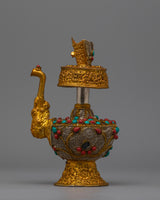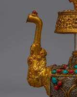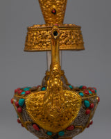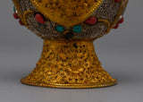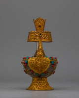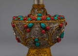 Artificial stones, such as coral and turquoise, give the Bhumba a dramatic splash of color and significance. The Bhumba comes with spiritual meaning and aesthetic appeal due to the combination of turquoise and coral stones set against luminous electroplating. This Traditional Tibetan Bhumba blends traditional design features with superb craftsmanship and is perfect for ceremonial application or as a cherished decorative object. It adds elegance and spiritual depth to any situation.