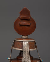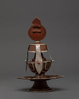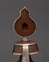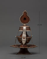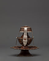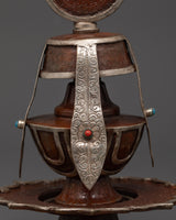 This handmade Tibetan Life Vase, also known as Tsebum, is a deeply symbolic ceremonial object adored by Vajrayana Buddhists. This sculpture, which is 21cm tall and 13cm wide, is composed of oxidized copper with delicate silver plating and inlaid coral stones. Weighing 0.37 kg, it is both visually appealing and spiritually profound, making it ideal for use on a home altar or in a ceremonial setting.