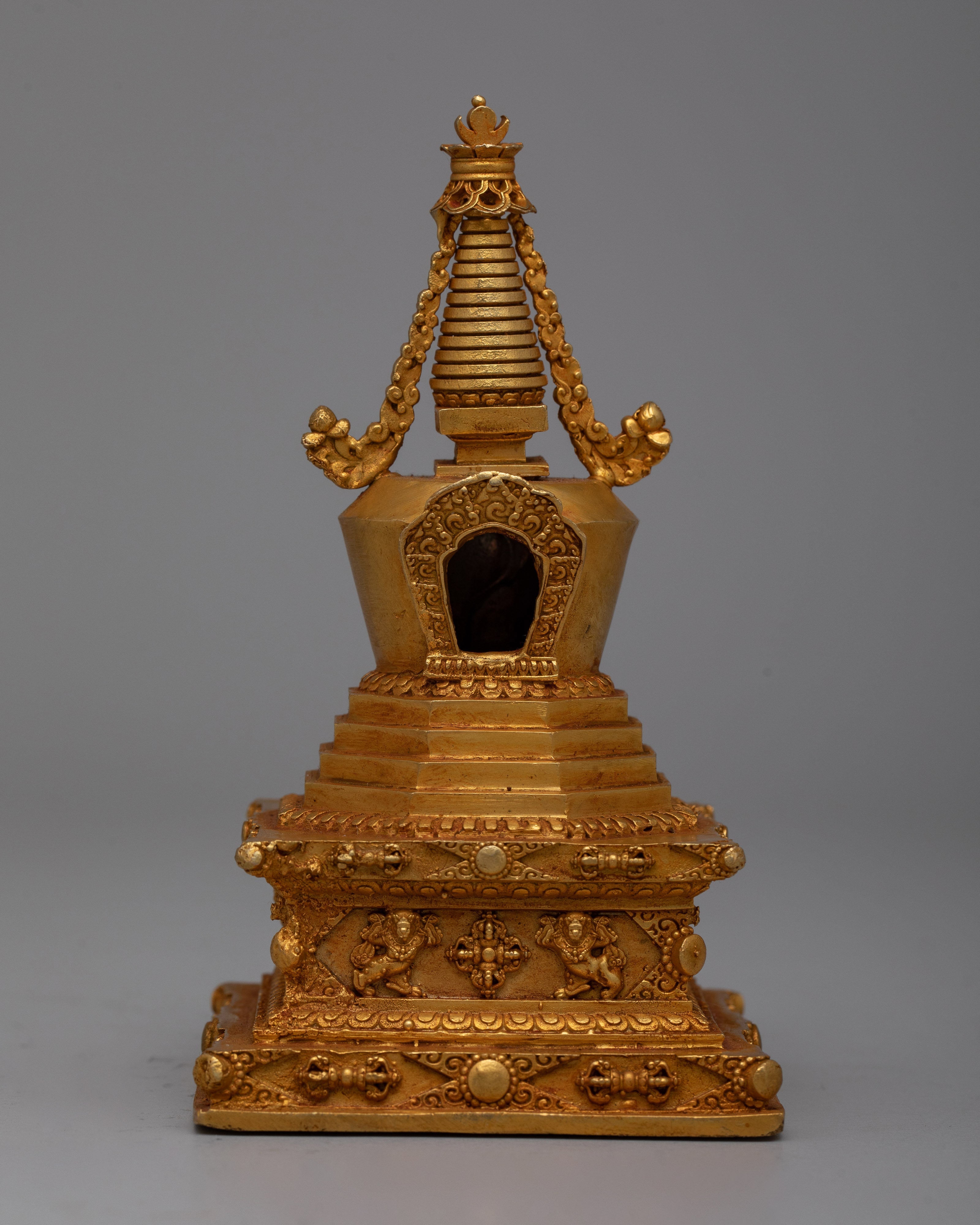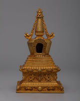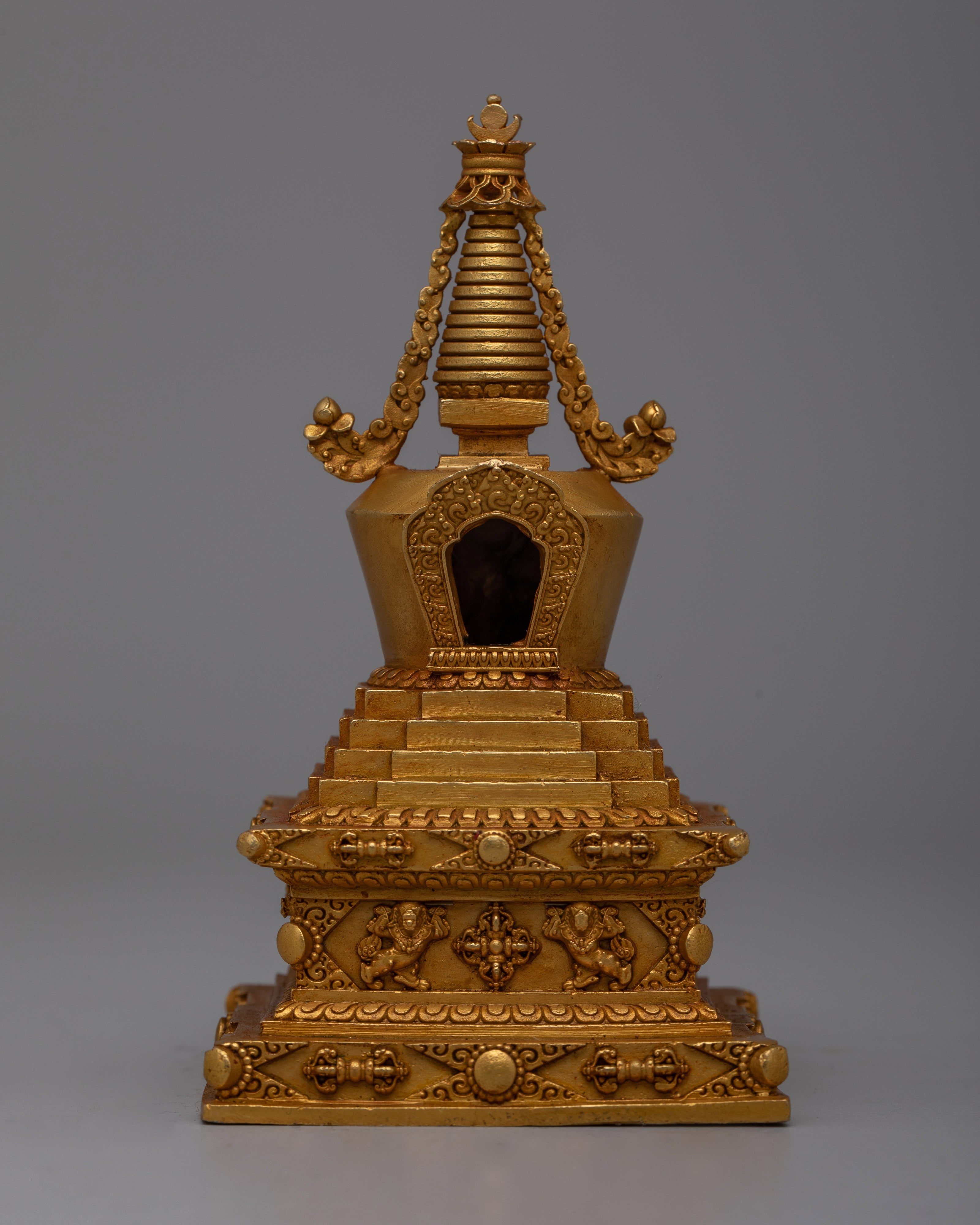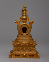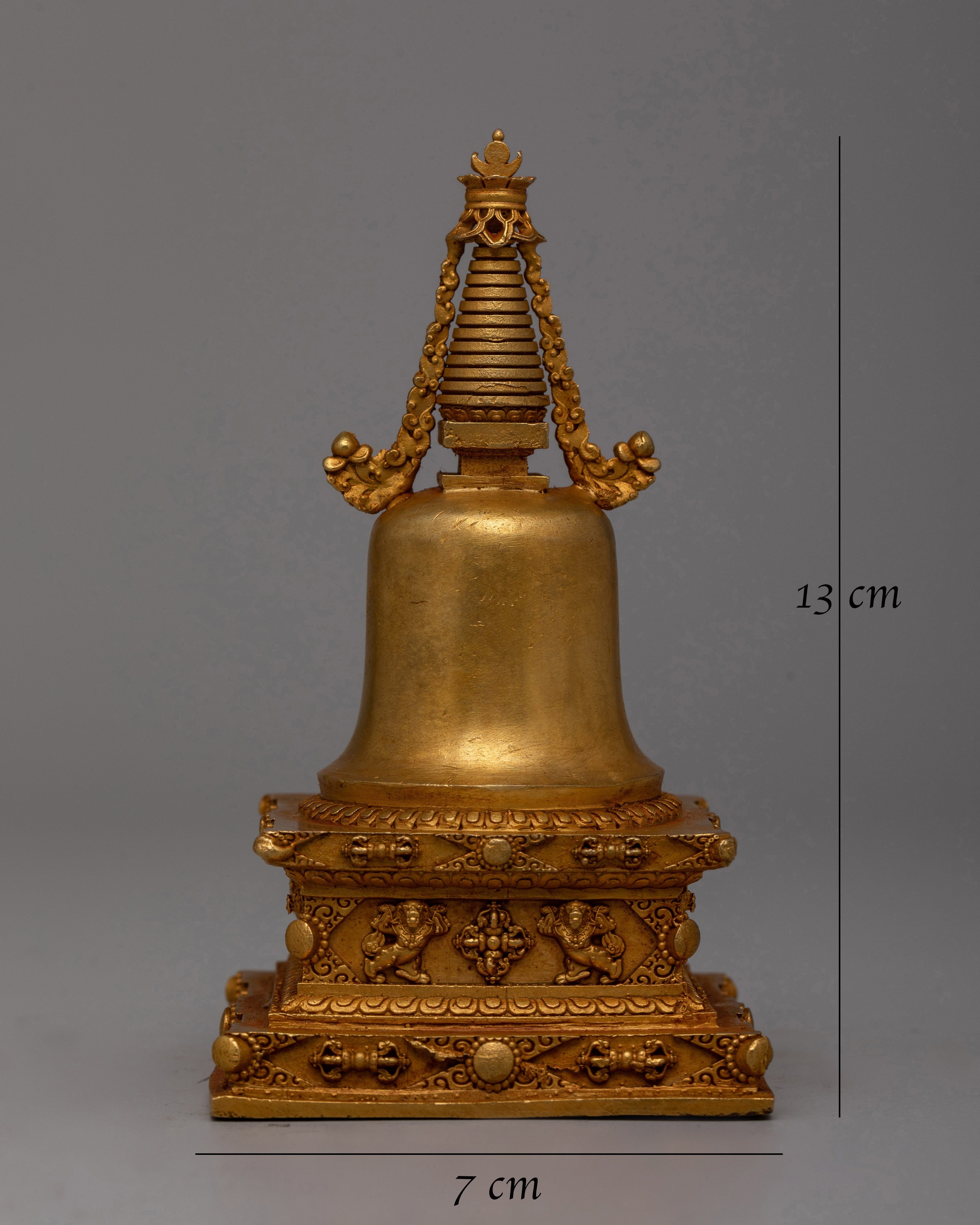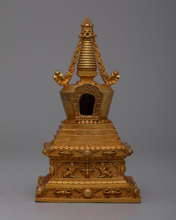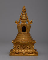 Whether arranged in a meditation area, shrine room, or sacred altar, this eight-piece Buddhist stupa set evokes respect and introspection. Their exquisite designs and shining Gold Plating operate as powerful reminders of the Buddha's ageless knowledge and compassion, pointing practitioners in the direction of enlightenment and freedom from suffering.