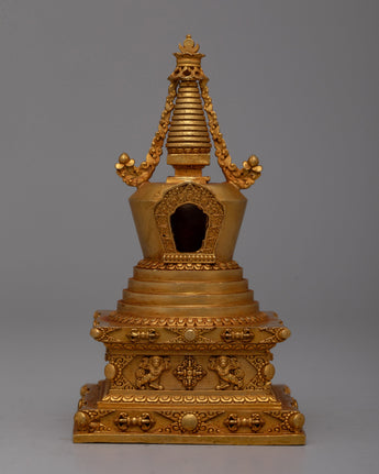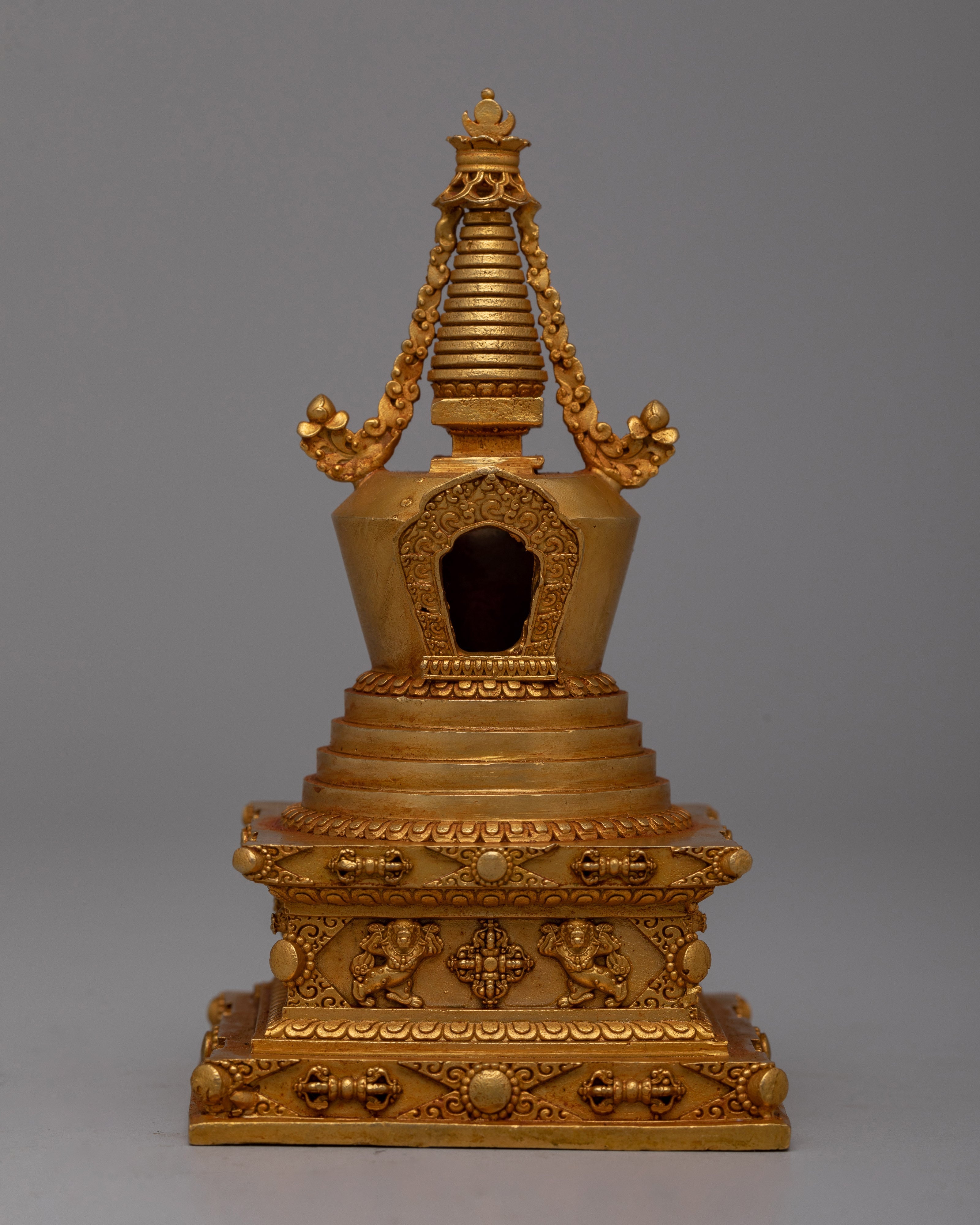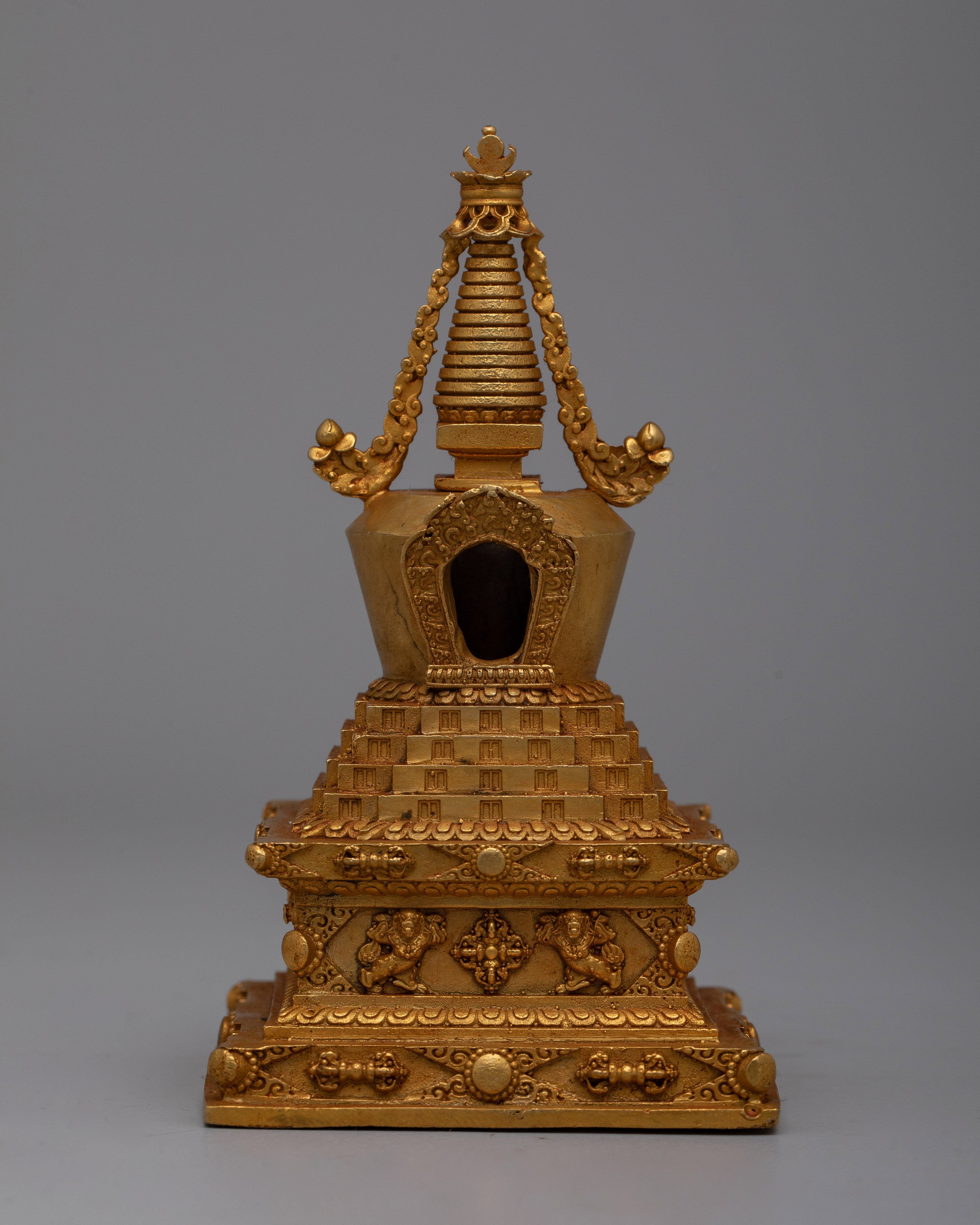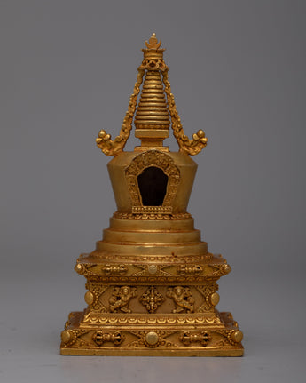 Whether arranged in a meditation area, shrine room, or sacred altar, this eight-piece Buddhist stupa set evokes respect and introspection. Their exquisite designs and shining Gold Plating operate as powerful reminders of the Buddha's ageless knowledge and compassion, pointing practitioners in the direction of enlightenment and freedom from suffering.