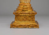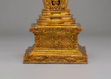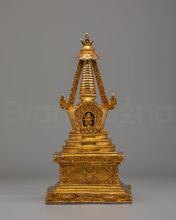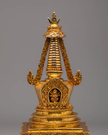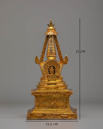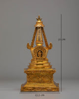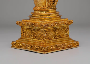 Every detail of this stupa has been meticulously crafted to represent the sacred path to enlightenment. The elegant tiers, adorned with golden motifs, symbolize purity, compassion, and wisdom, while the base and crown are embellished with detailed patterns that reflect the rich artistry of Tibetan Buddhism. The mercury gold plating not only enhances its visual beauty but also imparts spiritual energy, amplifying positive vibrations during rituals and meditation. Ideal for altars, meditation rooms, or sacred spaces, this stupa serves as a powerful symbol of devotion and inner harmony. Its timeless design makes it a perfect addition for those seeking to deepen their spiritual practice and bring a sense of peace and mindfulness into their surroundings.