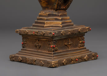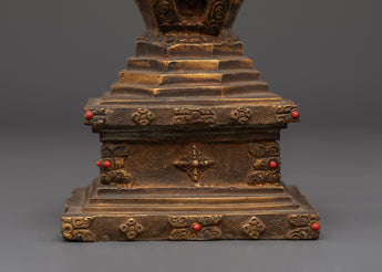 This Copper and gold-plated stupa with Antique Finishing is a remarkable spiritual artifact that combines beauty with deep symbolism. The gold plating not only enhances its visual appeal but also represents purity and divine energy, elevating your spiritual environment. Adorned with intricate coral stone accents, the stupa is believed to amplify healing energies, promoting physical vitality and emotional balance. Its antique finish adds a charm, making it both a powerful spiritual tool and an elegant decorative piece. Rooted in Tibetan and Buddhist traditions, this stupa serves as a meaningful reminder of spiritual growth and cultural heritage, perfect for enriching your meditation or ritual space.