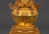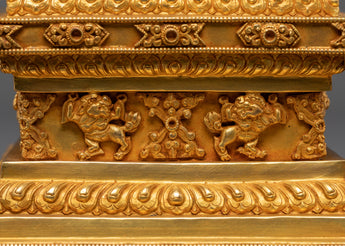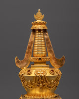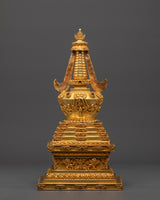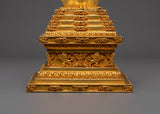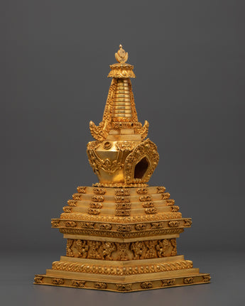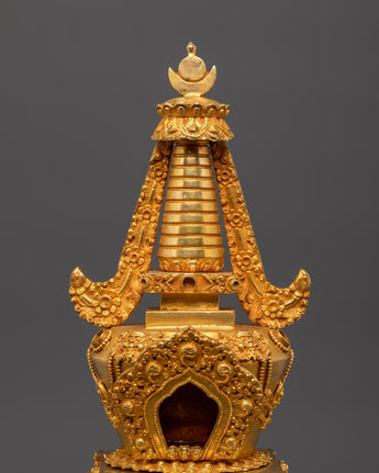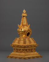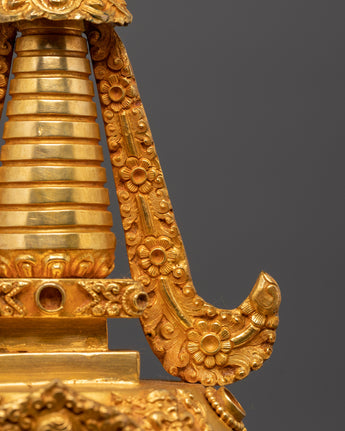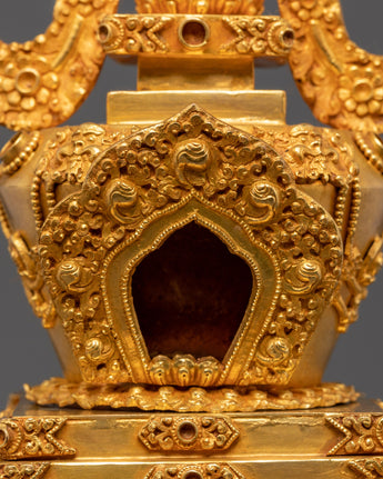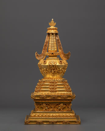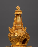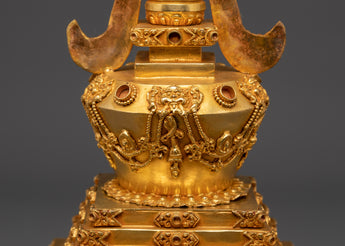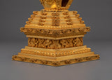 This stupa's design is inspired by Tibetan art and features spiritual elements representing the journey to enlightenment. The copper body provides a warm, natural finish, while the gold plating adds elegance and divinity. This stupa is not only a lovely decorative piece, but also a sacred emblem in Buddhist culture. It is frequently utilized in meditation techniques to promote calm, wealth, and protection, making it an ideal addition to any shrine or meditation corner.