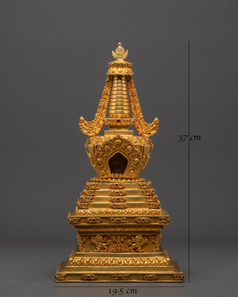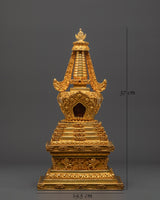 Enhance your house decor with this handcrafted decorative traditional stupa, a stunning depiction of Buddhist culture. Made of copper and beautifully gold-plated, this Tibetan meditation shrine adds a quiet and serene presence to any environment. Standing tall and displaying beautiful craftsmanship, this stupa is not just an art object, but also a spiritual emblem of enlightenment and tranquillity. Please place it in your home to create a relaxing environment and connect with the more profound truths of spirituality.