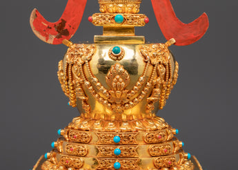 This handcrafted Gold Plated Buddhist Stupa is a stunning decorative piece that brings both beauty and spiritual significance to your home. Measuring 34cm tall and 17.5cm wide, it showcases exquisite craftsmanship with intricate carvings and jewel-like accents made from turquoise and coral artificial stones. Crafted with a copper body and authentic Tibetan components, this stupa symbolizes the path to enlightenment and fosters inner peace. Perfect for meditation rooms, living areas, or home altars, it creates an atmosphere of calm and mindfulness, making it a meaningful addition to any space seeking spiritual harmony.