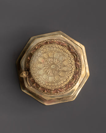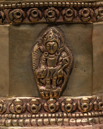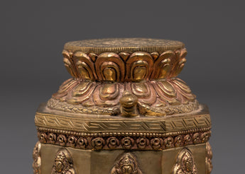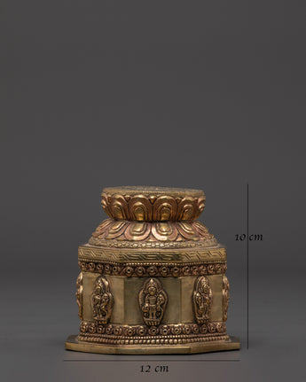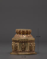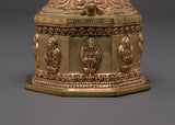 Meticulously handcrafted by skilled artisans, this Gold Plated Dharma Dhatu beautifully blends silver and gold plating to create a striking visual and spiritual centerpiece. Measuring 10 cm in height, 12 cm in width, and weighing 1.25 kg, it offers a substantial presence perfect for any personal altar or sacred space. The intricate carvings of different deities and lotus motifs enhance its symbolic significance, making it an ideal gift or meditative focus. This piece serves as a powerful reminder of the Dharma’s eternal truths and guides you on the path to inner peace and enlightenment.