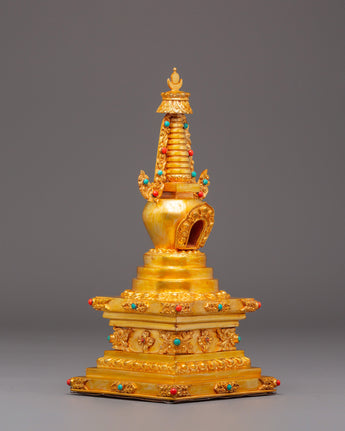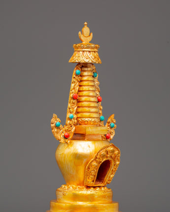 Golden Stupa for Altar | Gold Plated Copper with Coral & Turquoise Stones