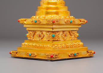 This golden stupa for an Altar is a radiant symbol of enlightenment, offering, and spiritual protection in Tibetan Buddhism. Standing at 24 cm in height and 11.5 cm in width, this elegant stupa is crafted from a copper body with a rich gold-plated finish, making it an inspiring centerpiece for any meditation space or altar. Stupas are revered as sacred monuments representing the enlightened mind of the Buddha and the path to liberation, making this piece a powerful spiritual presence for your home.