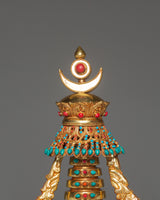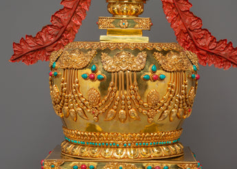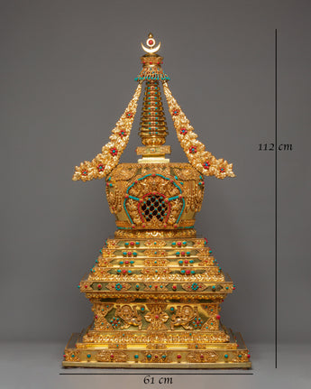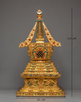This Golden Stupa for Altar is a magnificent work of art that brings spiritual enlightenment, protection, and beauty to your sacred space. Standing at an impressive 112cm in height and 61cm in width, and weighing a substantial 30.82kg, this stupa commands attention and exudes a deep sense of serenity. Handcrafted from copper and meticulously gold-plated, the stupa is adorned with coral and turquoise stones, which enhance its spiritual significance and aesthetic appeal. It serves as a powerful symbol of peace, enlightenment, and devotion in Tibetan Buddhism and other Eastern spiritual traditions.