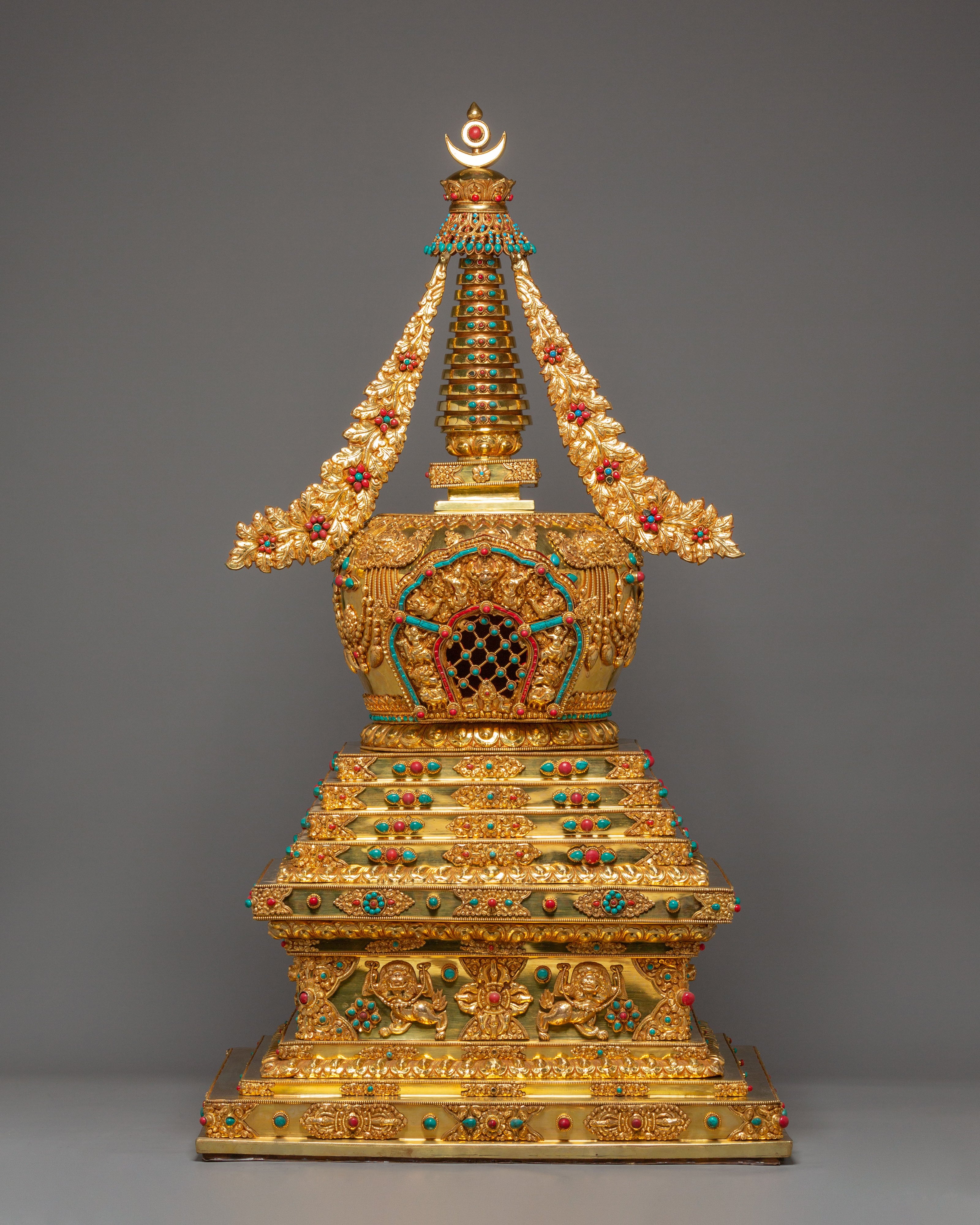 The intricate design of the stupa is both symbolic and breathtaking. At the base, delicate carvings of divine figures and protective symbols surround the structure, representing guardianship and spiritual strength. The stupa’s towering body tapers to a pinnacle, symbolizing the path to enlightenment — rising higher with each layer of the finely detailed structure. The coral and turquoise inlays add vibrant color, representing the union of earthly and celestial energies. Together, the motifs reflect the eternal flow of energy, harmony, and the timeless quest for wisdom.