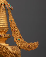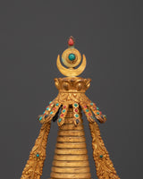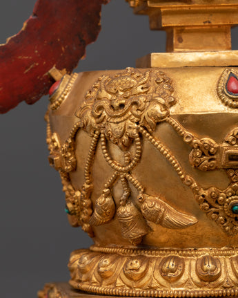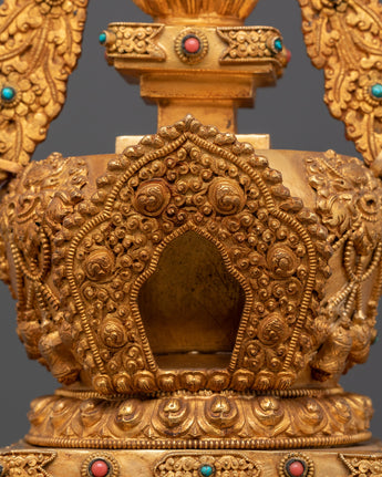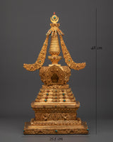 Introducing the Handcrafted Buddhist Alter Stupa, a stunningly detailed spiritual sculpture that will bring calm and positive energy into your home. This stupa is 48cm tall and 25.5cm wide, making it ideal for any altar or meditation room. Made of copper and gold-plated materials, it exudes elegance and serenity. The intricate design is adorned with artificial stones such as turquoise and coral, which lend brilliant color and a sense of spiritual harmony to the item.