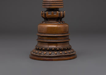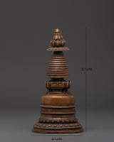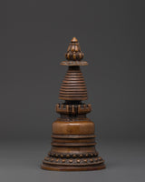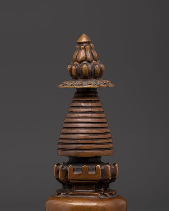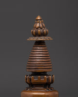 The design features structured symbols and an ornate spire, which represent the elements and the road to awakening. The oxidized copper finish adds visual depth and a sense of legacy to the piece, evoking traditional Himalayan craftsmanship. Stupas are revered in Buddhist tradition for their symbolism of wisdom and tranquility, making this item excellent for holy areas and altar decor.
