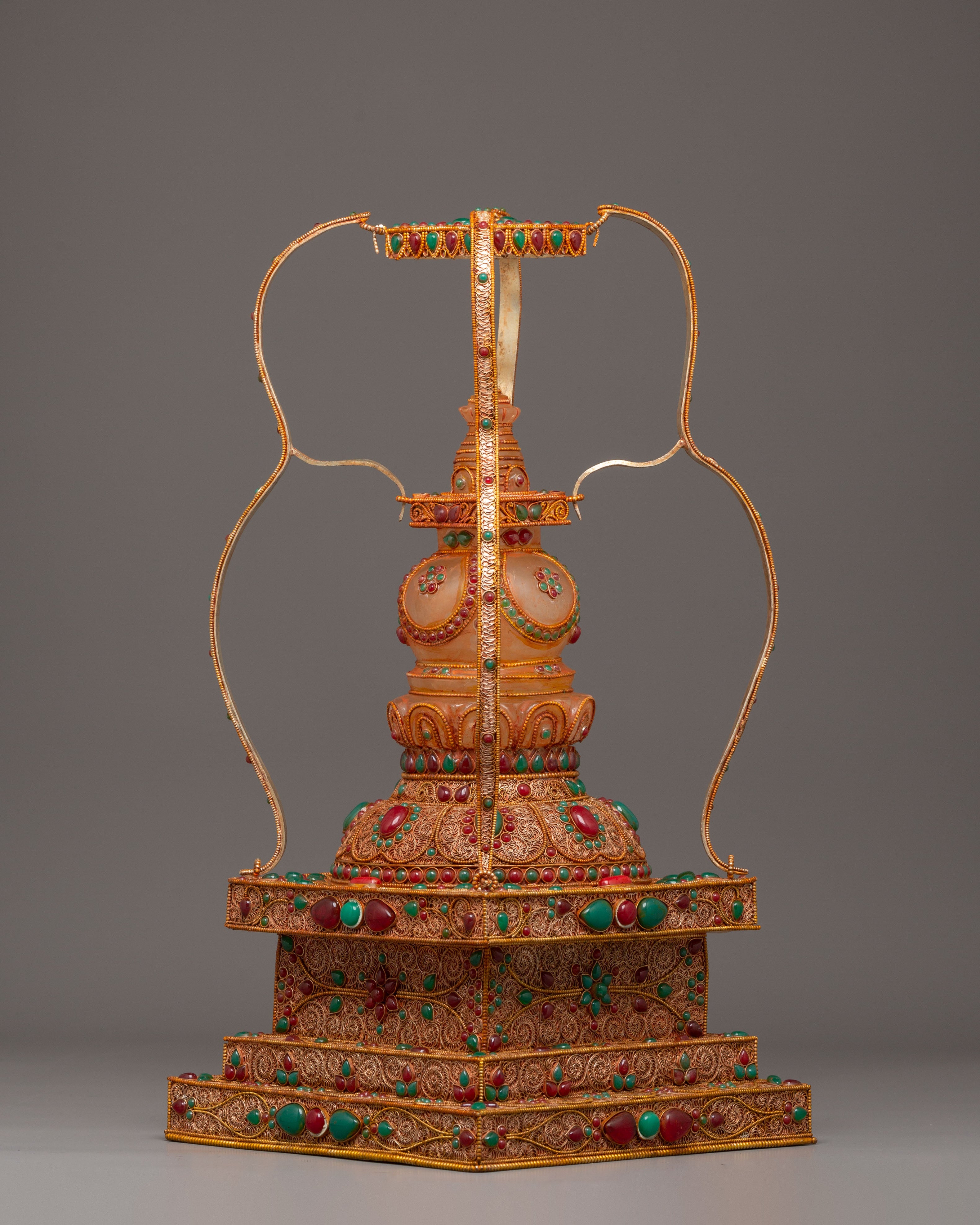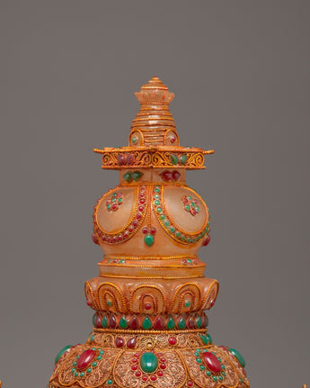 The stupa symbolizes the Buddha's enlightened intellect and the journey to nirvana. Its layered design signifies the stages of enlightenment, while the copper body symbolizes the enduring strength and the teachings of the Buddha. The filigree work provides a sophisticated and delicate touch, with flowing designs that suggest a connection between the material and spiritual realms. The coral and turquoise stones represent spiritual protection, enhancing the stupa's ability to protect and guide the practitioner on their spiritual journey.