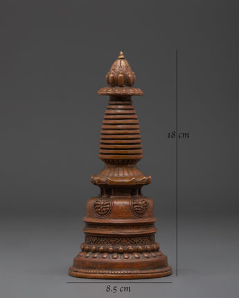 This handcrafted traditional stupa is a precious work of Buddhist art that represents enlightenment, peace, and spiritual devotion. This stupa, measuring 18cm in height and 8.5cm in breadth, is made of oxidized copper and has a rich, ancient finish that symbolizes Tibetan heritage and craftsmanship. It is intended for use as a spiritual centerpiece in meditation rooms, home altars, and religious areas, exuding serenity and respect.