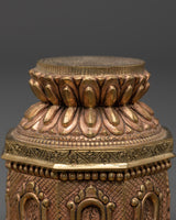 Each Dharma Dhatu is expertly handcrafted by skilled artisans employing traditional techniques, capturing the true essence of Buddhist teachings. Made from copper with a gold-plated finish, this sacred artifact brings a refined elegance to your altar or spiritual collection. Whether incorporated into meditation or displayed as a symbol of inner calm, it serves as a lasting reminder of wisdom and harmony.