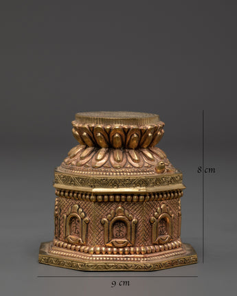 This Handmade Buddhist Dharma Dhatu is an exquisitely crafted spiritual symbol created to elevate your meditation environment and foster a more profound sense of peace. Made from copper with a gold-plated finish, it represents the Buddhist Dharma teachings, serving as a continual reminder of the journey toward enlightenment. Measuring 8cm tall and 9cm wide, it adds both meaningful spiritual significance and elegant beauty to your practice.