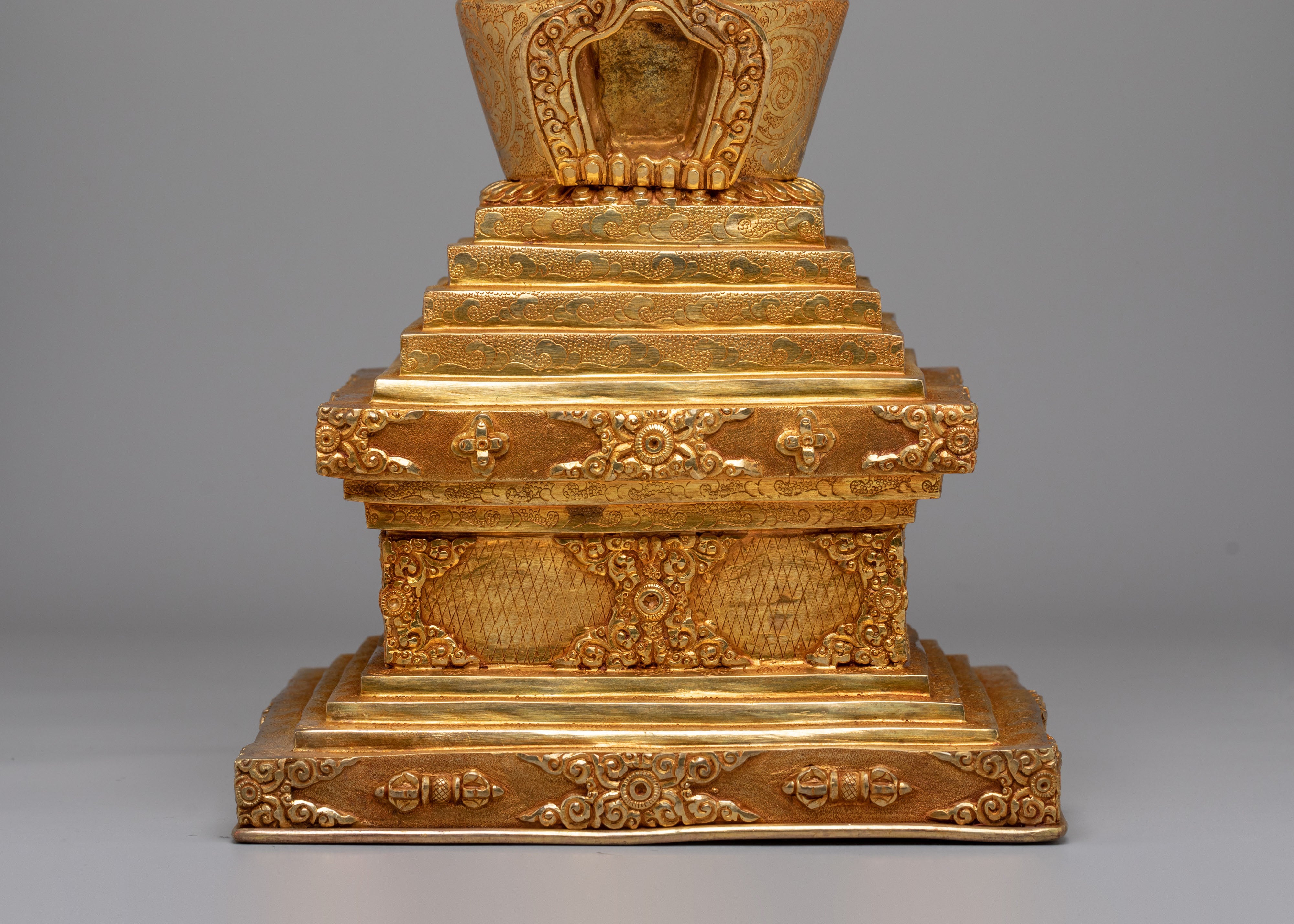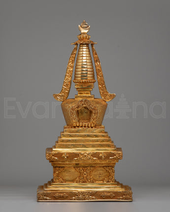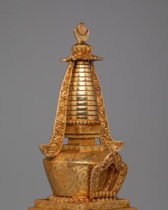 Every detail of this stupa is meticulously crafted, capturing the essence of traditional Buddhist artistry. The mercury gold plating enhances the stupa's spiritual presence, while the copper base provides grounding energy. Ideal for practitioners, collectors, or anyone seeking a meaningful piece of spiritual decor, this stupa fosters a sense of calm and devotion. Place it in your home, office, or meditation space to invite serenity and positive energy, making it a lasting symbol of peace and spiritual connection.