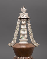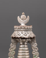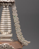 This Oxidized Copper Tibetan Buddhist Stupa brings peace and spiritual depth to your sacred area. Standing 31cm tall, 15.5cm broad, and weighing 2.67kg, this handcrafted masterpiece exemplifies traditional Buddhist workmanship. It is made of an exquisite blend of oxidized copper and silver plating and embraces sacred symbolism, expressing enlightenment and inner balance. Each detail has been skillfully created by experienced artisans, transforming this stupa into a spiritual centerpiece that carries millennia of cultural and spiritual history. Its distinctive silver-plated highlights contrast nicely with the antique tones of oxidized copper, giving it a significant presence in any meditation area, yoga studio, or prayer room.
